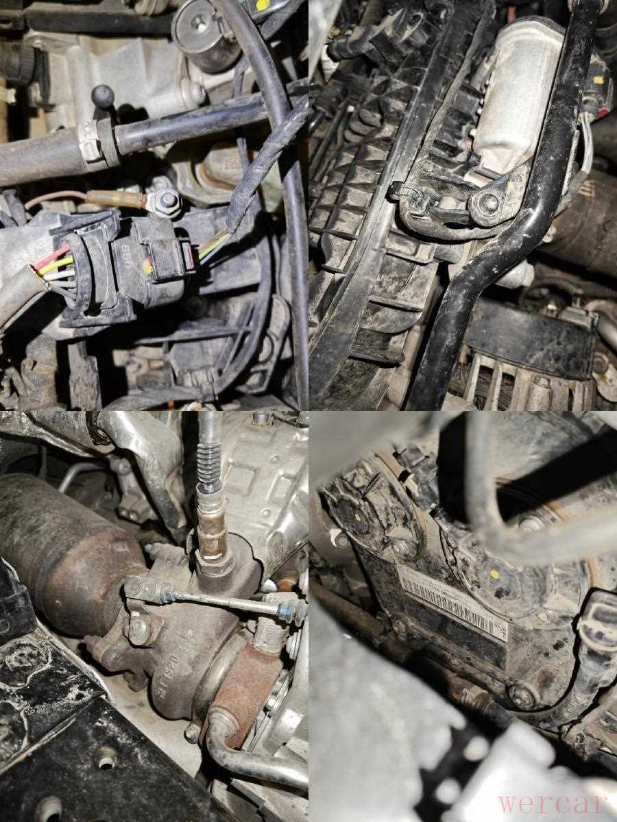 目前气门室盖,进气歧管,排气歧管和正时边盖螺丝都没有拆卸痕迹,可以排除发动机的分解维修,但是缸体有隐约的渗漏痕迹,从上面看不太清楚,一会儿再从底盘下面确认一下。