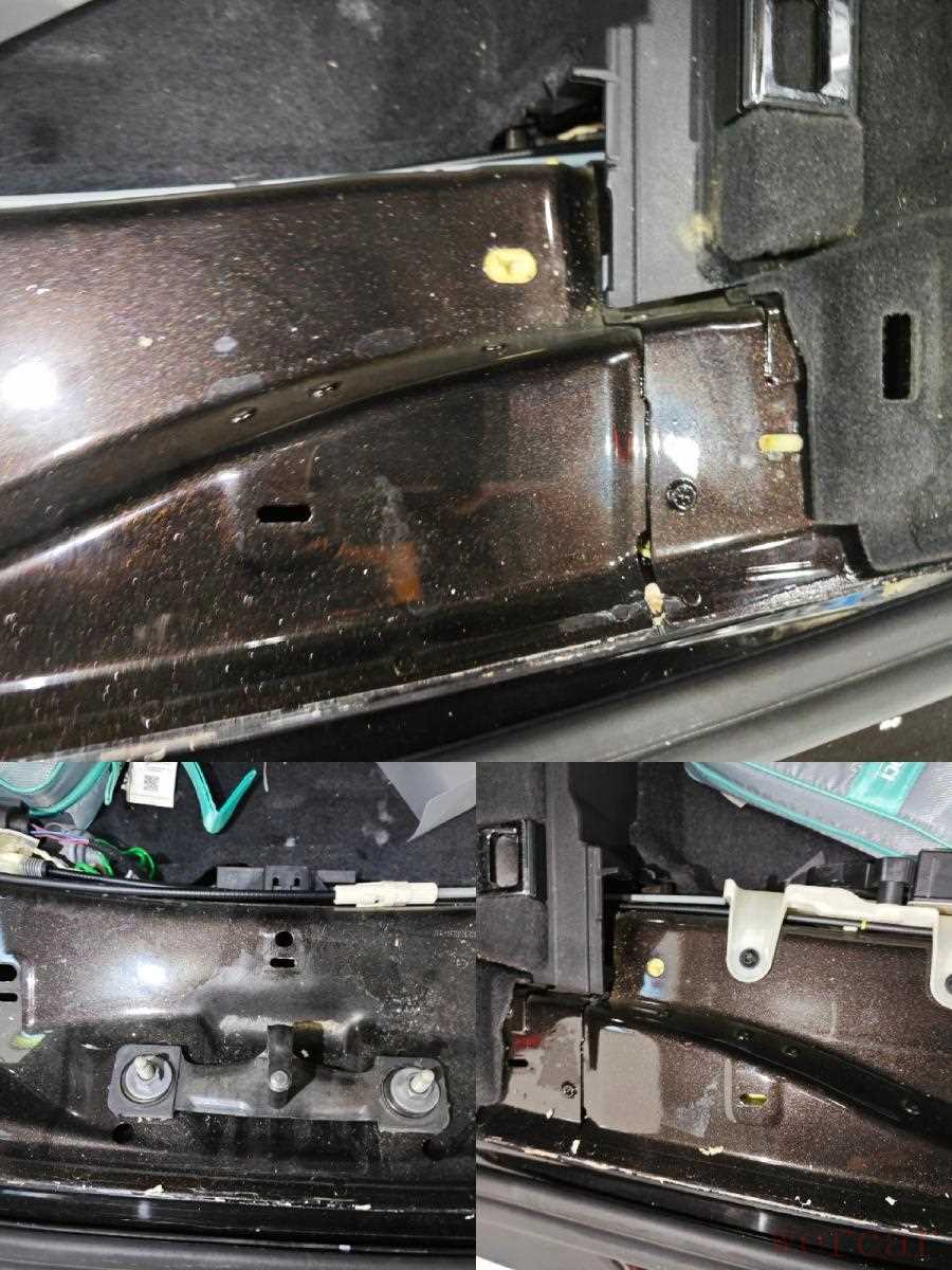 拆掉后备箱的饰板,就能看见后围板了,结果没有问题,尾门锁块的固定螺丝也没拆卸,如果有变形修复,这个锁块不拆可不好维修,说明后面碰撞力度也不大。外观检测完,整体车况只能说还行,车头车尾和左侧都有碰撞,但都不太严重,买家应该能接受的。