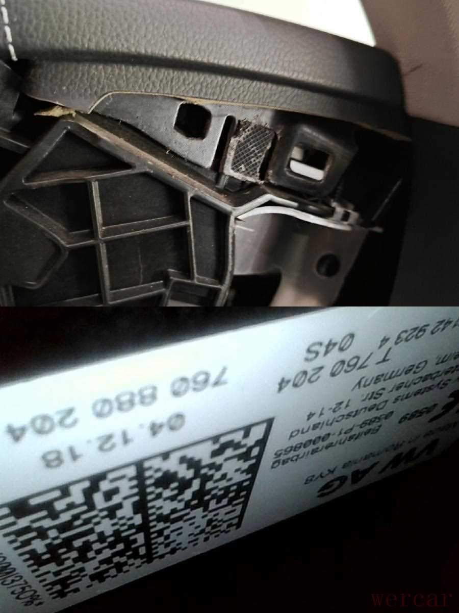 再看副驾驶气囊,首先,仪表台皮革没有重新包裹,副驾气囊如果弹开,仪表台肯定要重新包裹一次,副驾气囊的生产日期也在车辆出厂日期内,好消息,气囊还是原厂的。