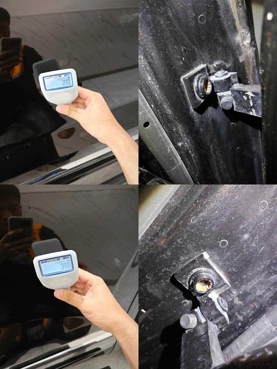 继续往后检测,又有新情况了,后尾门钣金,腻子厚度有些高,打开尾门查看固定螺丝,没有任何拧动过的痕迹,说明尾门没更换。谨慎起见,内部的后围板还是查看一下。