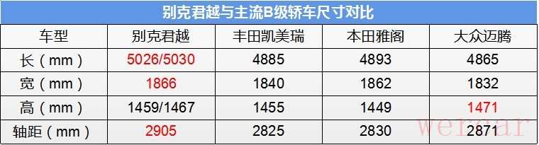 通过对比不难发现,别克君越在尺寸上相比主流B级轿车更具优势,也就是说它有着更宽敞的乘坐空间,这对于喜欢大空间的国内消费者来说,还是比较有吸引力的。