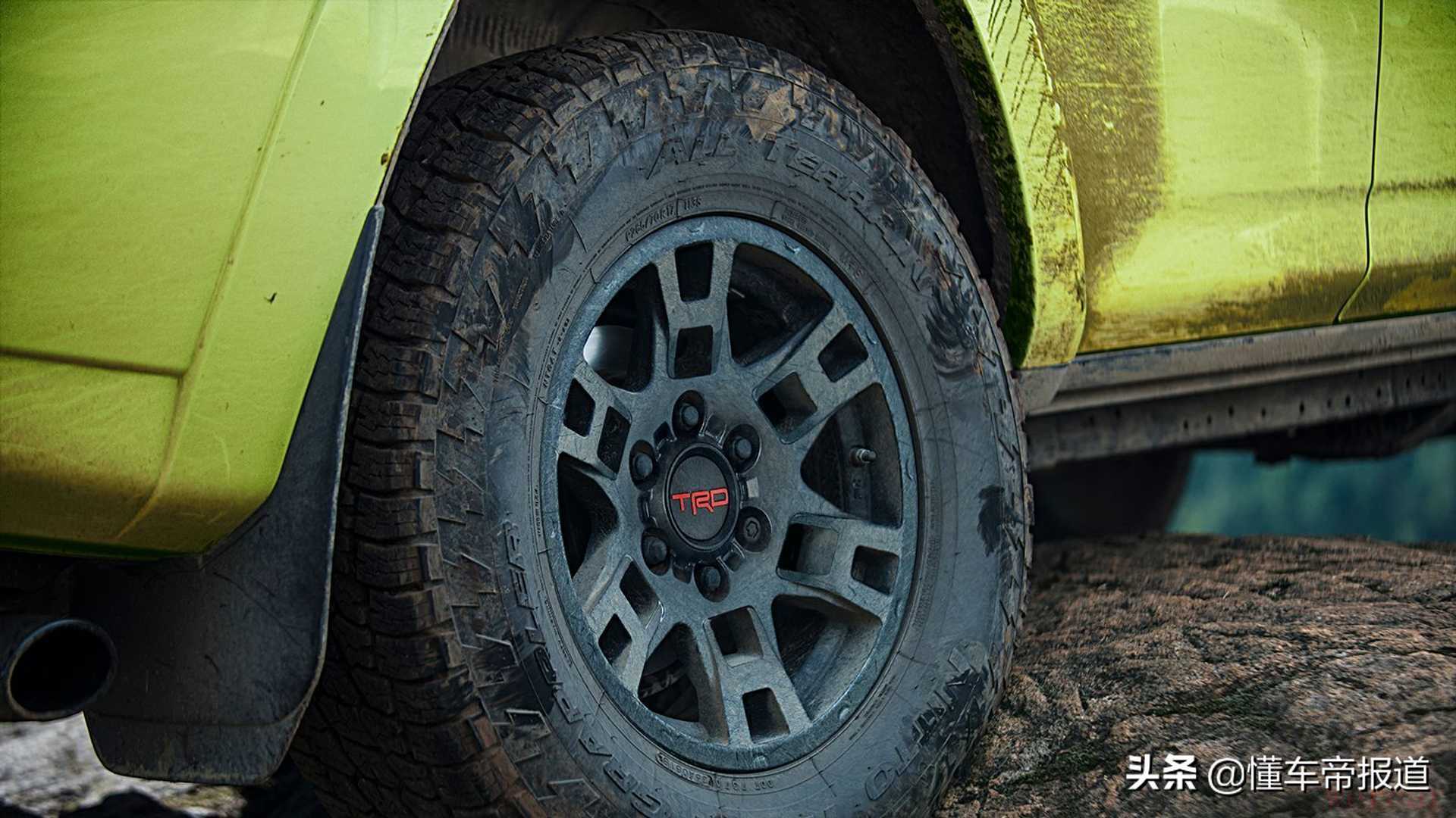 TRD Pro车型标配黑色轮辋、越野轮胎、挡泥板,并对底盘高度进行提升