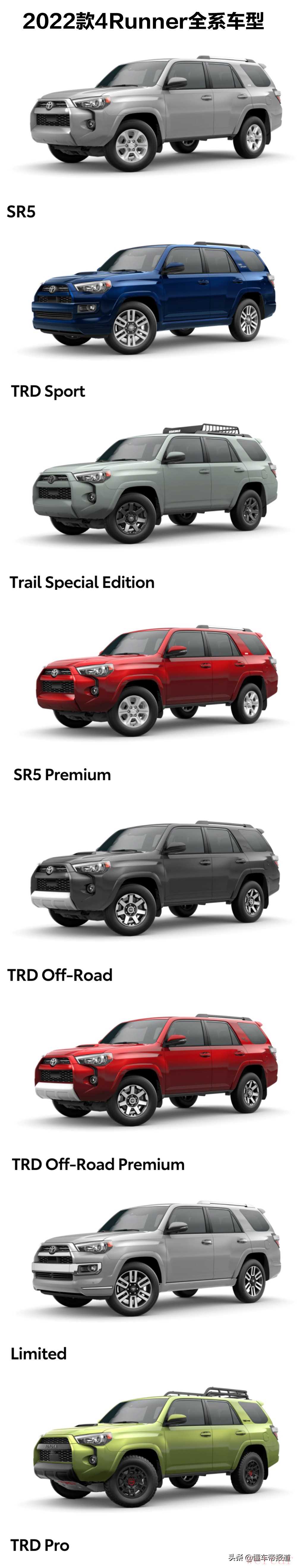在国内市场,它有个约定俗成的名字——超霸,寓意“超越霸道”,这款车就是丰田基于普拉多平台开发的北美版姊妹车4Runner。时下,丰田4Runner系列迎来2022款更新,新车主要在配置层面进行提升。根据丰田北美官网信息,2022款4Runner推出8款车型可选,其中入门版售价为37305美元,约合人民币24万元,顶配TRD Pro车型售价为52120美元,约合人民币34万元。