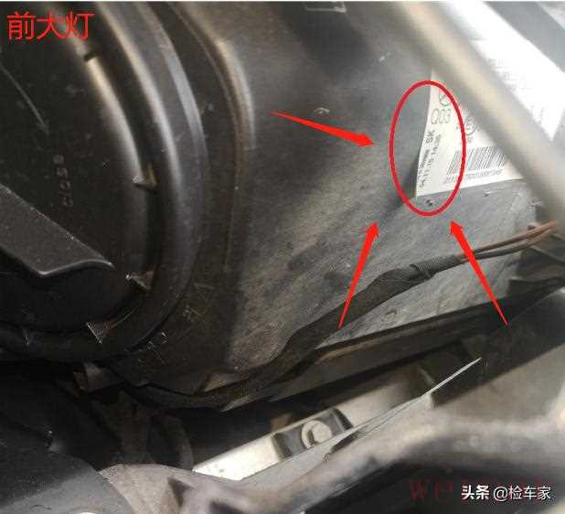继续检测,发现两前大灯存在拆卸痕迹,但是大灯的生产日期跟车辆出厂日期无太大差距,因此判定是前部发生事故后维修时所导致的拆卸现象。
