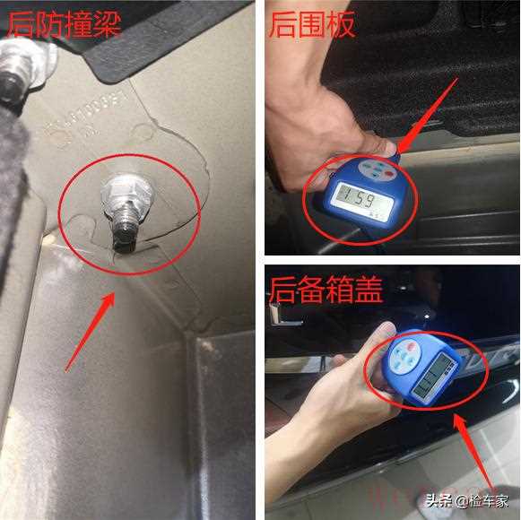打开后背箱继续检查,发现后防撞梁存在拆卸痕迹,螺钉存在明显的滑丝现象。但是备胎槽和后围板的漆面数据都正常,而且后被箱盖也没有钣金或者喷漆痕迹,那么由此可以还原事故现场当时的碰撞情况,这次碰撞只是导致了后保险杠和后防撞梁受损,碰撞的位置还是比较低,并没有伤及后备箱盖。