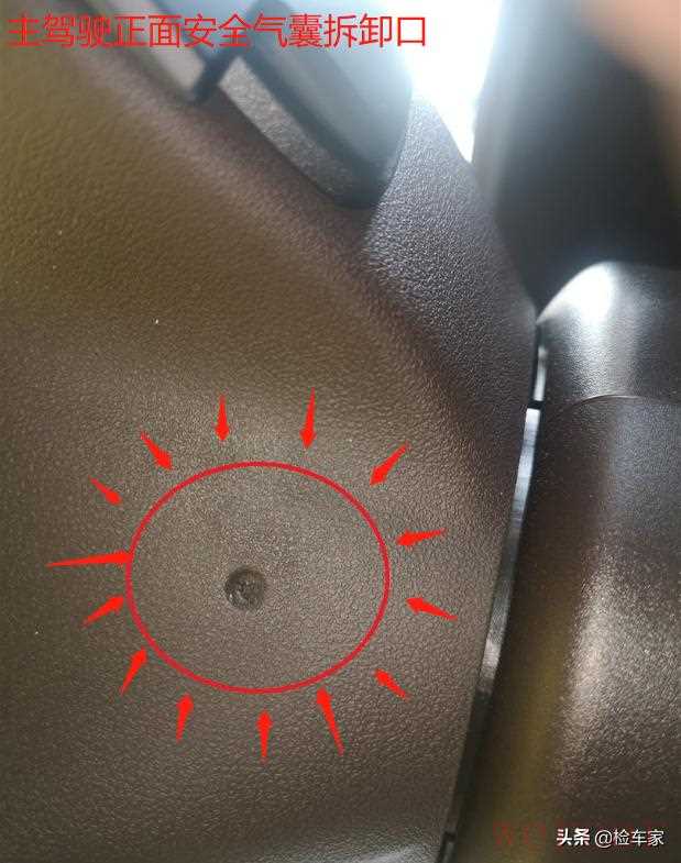 另外,在车内检测过程中我又发现一个大问题:主驾安全气囊存在拆装痕迹!图中可以清楚的看见安全气囊拆装口的保护膜已经被捅破了,一般情况下这里是不会自然损坏的,除非是人为造成,但是有谁会没事弄这么个小孔呢?所以结合外观检测情况以及维保记录来看,判定此车存在疑似安全气囊拆装现象。