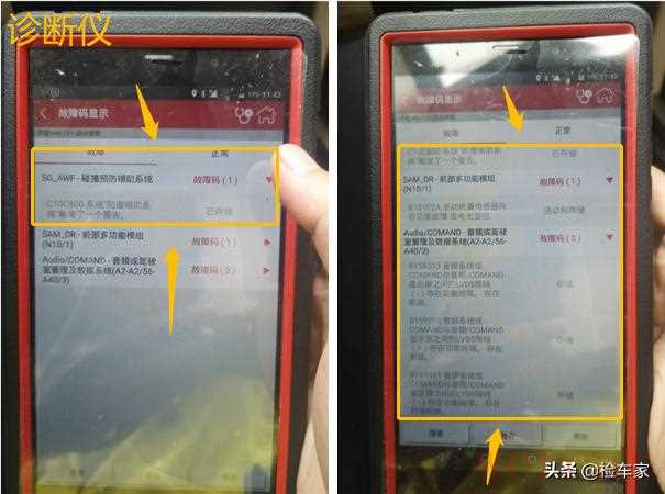接下来进行OBD检测,发现碰撞系统存在故障码,并且显示状态是“已储存”,推测是由于前部事故所导致。剩下的都是一些电子设备故障码,在功能检测的时候并没有发现什么问题,因此建议后期保养时顺带清除即可。