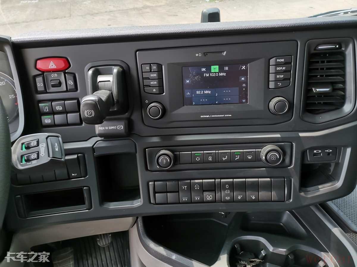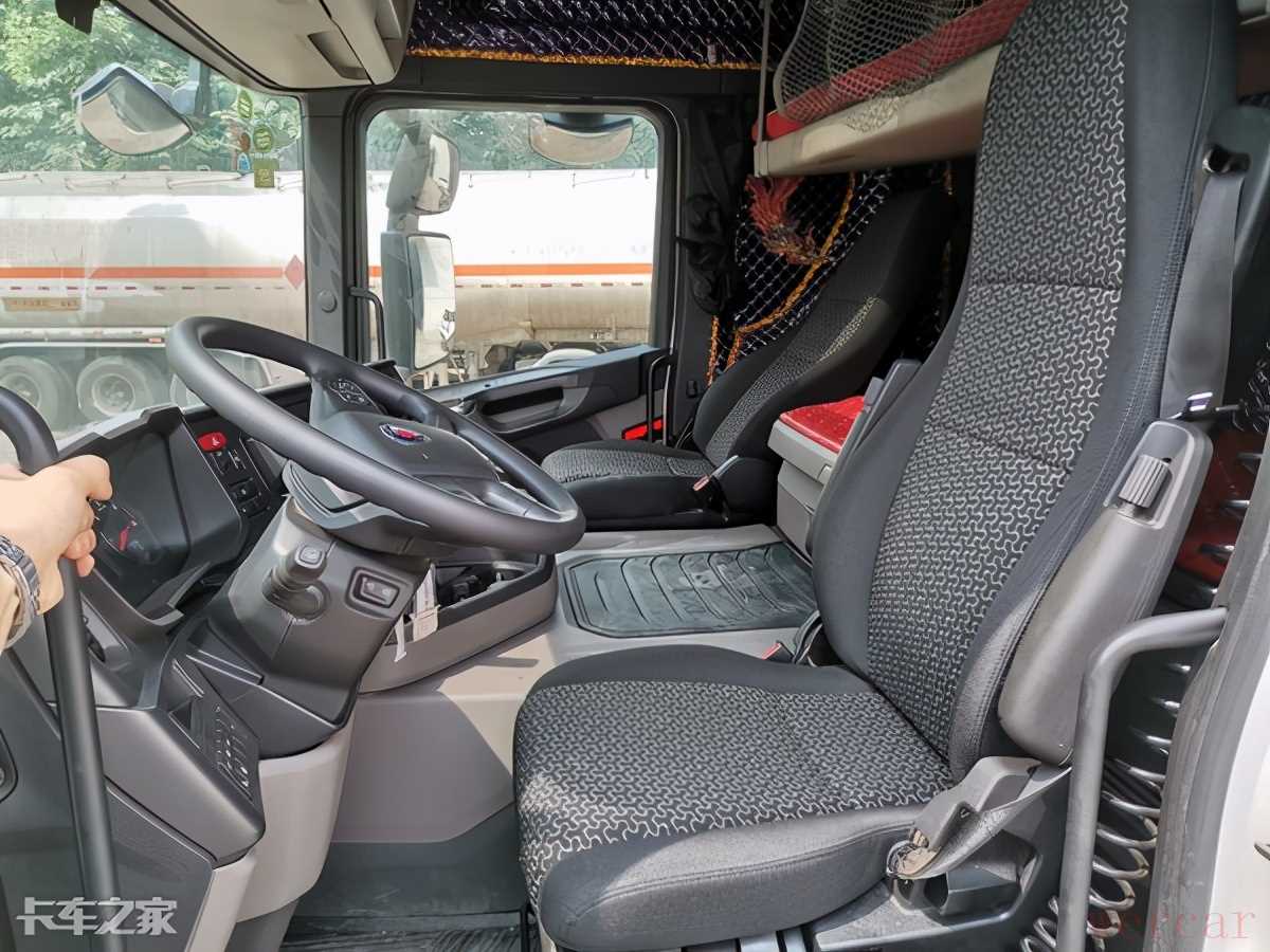 进入驾驶室,整体车高限制,使其内部中央地台并不是全平,但是和其他同类型车辆相比,斯堪尼亚把凸出部分做成了平台,能够在上面放置物品及踩踏,没有布置其他任何功能配置,影响平台使用,增大了空间,提升了使用效率。