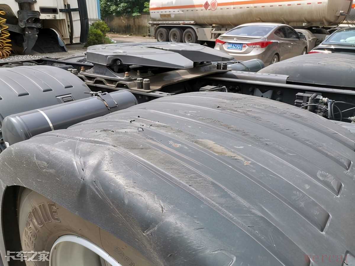 当然这种提升桥也不是没有坏处,提升后桥忘记放下,导致挡泥板与挂车发生了干涉,挡泥板上方刮擦严重,但即便如此,挡泥板也没有断裂,影响使用,可见原厂质量相当好。
