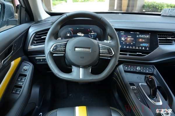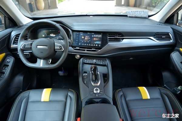 哈弗F7x的内饰主色尽管依然是黑色系,但其中有点缀了很多黄色的缝线和配色,让整个氛围更加活泼。