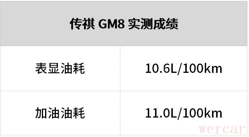 新款动力总成的调校是偏向平顺性,变速箱升挡比较积极,毕竟对于MPV来说舒适是放在第一位的。但整体的动力响应并不如原来的6AT来得直接,深踩油门变速箱降挡反应并不算快。在测试过程中GM8的表显油耗在10L以上,以我们以往测试传祺车辆的经验来判断,实际的加油油耗应该会更高一些。