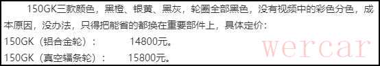 车身配色方面,GK150共有黑橙、银黄、黑灰三种配色,不过轮圈全部都是黑色的,而不是宣称片中的拼色轮圈。