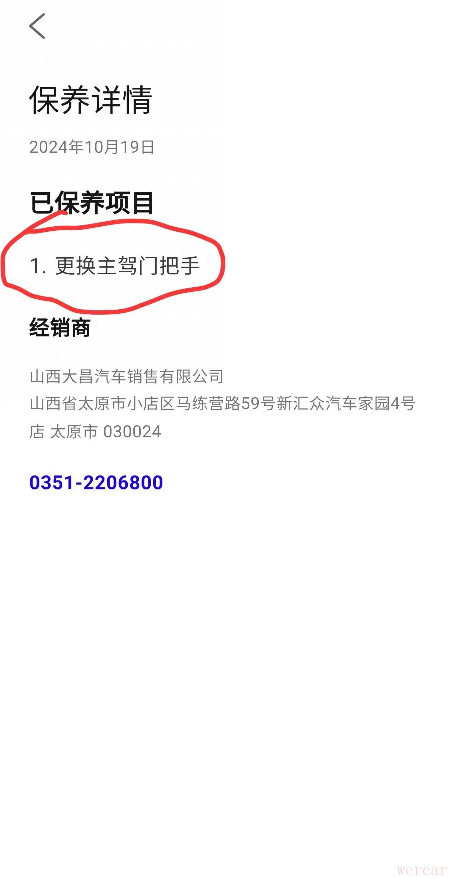 1.2024年10月发生主驾驶门把的弹出故障,处理方案是更换总成,这个问过4S,自己换一套是2000左右。
