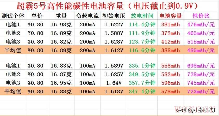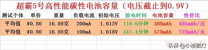 从以上测试结果来看,超霸5号高性能碳性电池以200毫安电流放电容量均值为388mAh,以100毫安电流放电容量均值为578mAh,容量中等,价格偏高,性价比中等,约723mAh/元。不适合大电流放电,可以用在小功率低耗电的电子产品中,如钟表、遥控器、电子秤等。