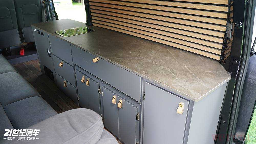 右侧是厨房区,操作台面的尺寸非常可观,比很多C型房车有过之无不及,下方储物空间十分丰富,可供储存日常烹饪所需的锅碗瓢盆。