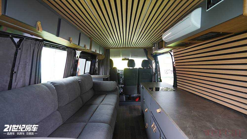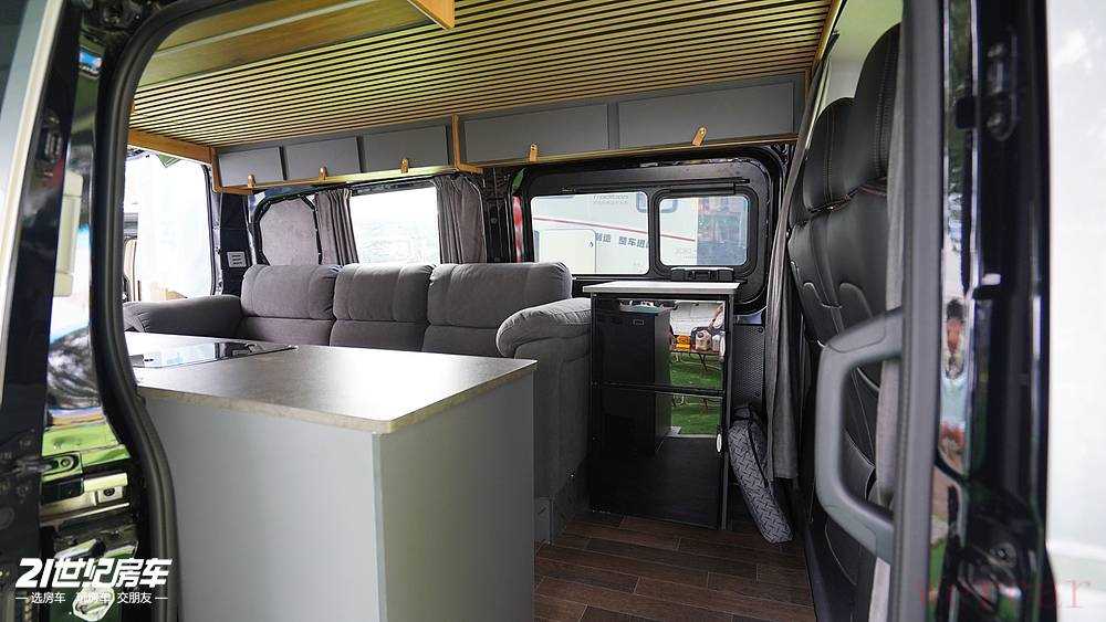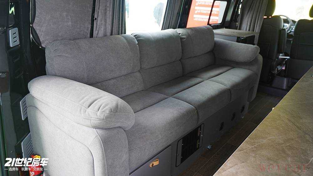 车内左侧配备一条长条沙发,座椅可拼接成床,晚上的时候睡眠需求可以满足。床铺下、侧柜等储物空间丰富,户外装备、行李轻松收纳,打造温馨又有序的移动居所。