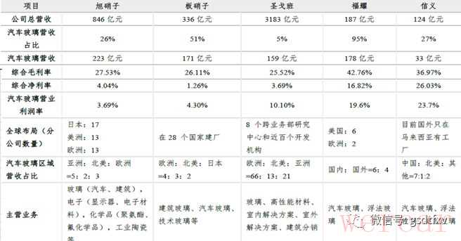 从营收规模上来看,福耀玻璃不是五家企业中最大的(产能扩张后将会是最大的),但是福耀的专注度是最高的,只做汽车玻璃及上游的浮法玻璃。福耀汽车玻璃营收占比高达95%,其他业务拓展也是在产业链上游衍生,布局了原材料浮法玻璃;板硝子的汽车玻璃营收占比也超过一半,并在建筑玻璃领域进行了大力布局;汽车玻璃也是信义玻璃和旭硝子的主要产品,营收占比保持在25%以上;圣戈班则将汽车玻璃作为辅助产品,营收占比仅为5%。