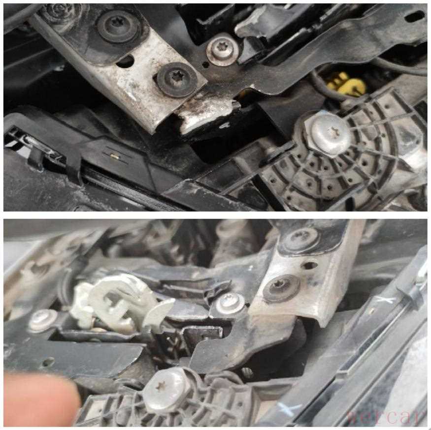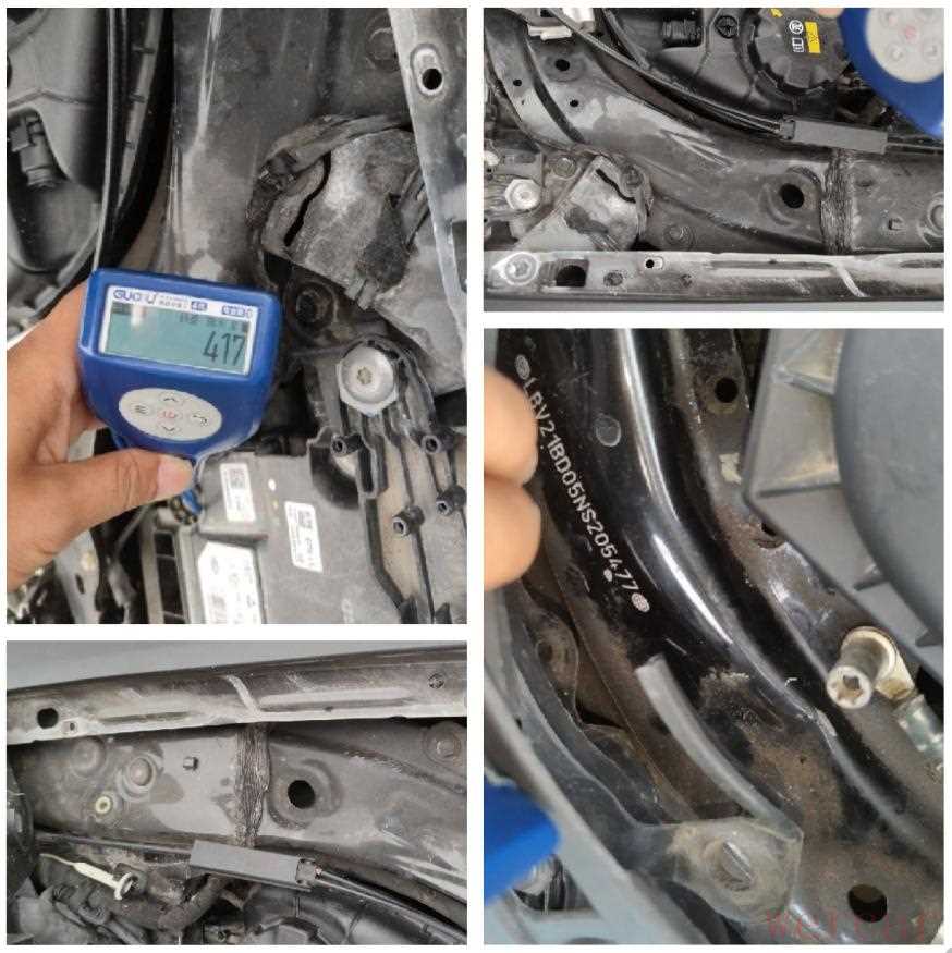 两边的叶子板骨架对比可以发现,右侧明显变形了,修复同样是相当的不走心,估计就大概拉了一下,都没完全修好;左侧翼子板骨架接口处的胶都是后打的,结合漆膜仪检测和整个车头前边事故的分析,左侧应该是把叶子板骨架靠前边的一截给更换了……