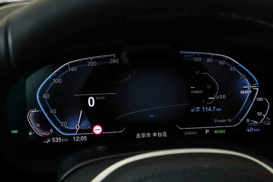 这台535Le拥有SPORT、HYBRID、ELECTRIC、ADAPTIVE和BATTERY CONTRL五种驾驶模式,其中HYBRID分项下还有COMFORT和ECO PRO两种不同的模式,区别在于动能回收的强度。