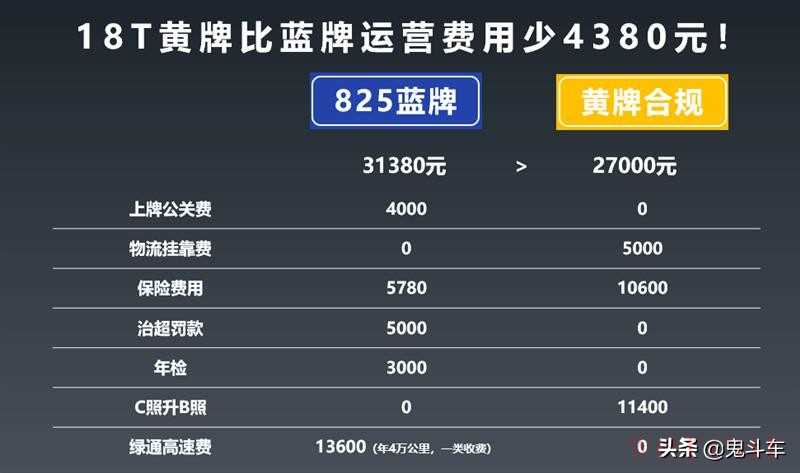 以大力哥18T为例,它比“蓝标825”轻卡货车多交物流挂靠费5000元;C照升B照11400元,还有年保险费10600元,整体费用在27000元左右。而825蓝牌轻卡花费更多,新规之下,购买“十吨王”的上牌公关费至少要4000元,保险费用5780元,治超罚款5000元,年检3000元,一年按4万公里计算,绿通高速费要13600元,整体费用在31380元。总体算下来,18T的黄标轻卡要比蓝牌825运营费用少4300多元,相对更划算。