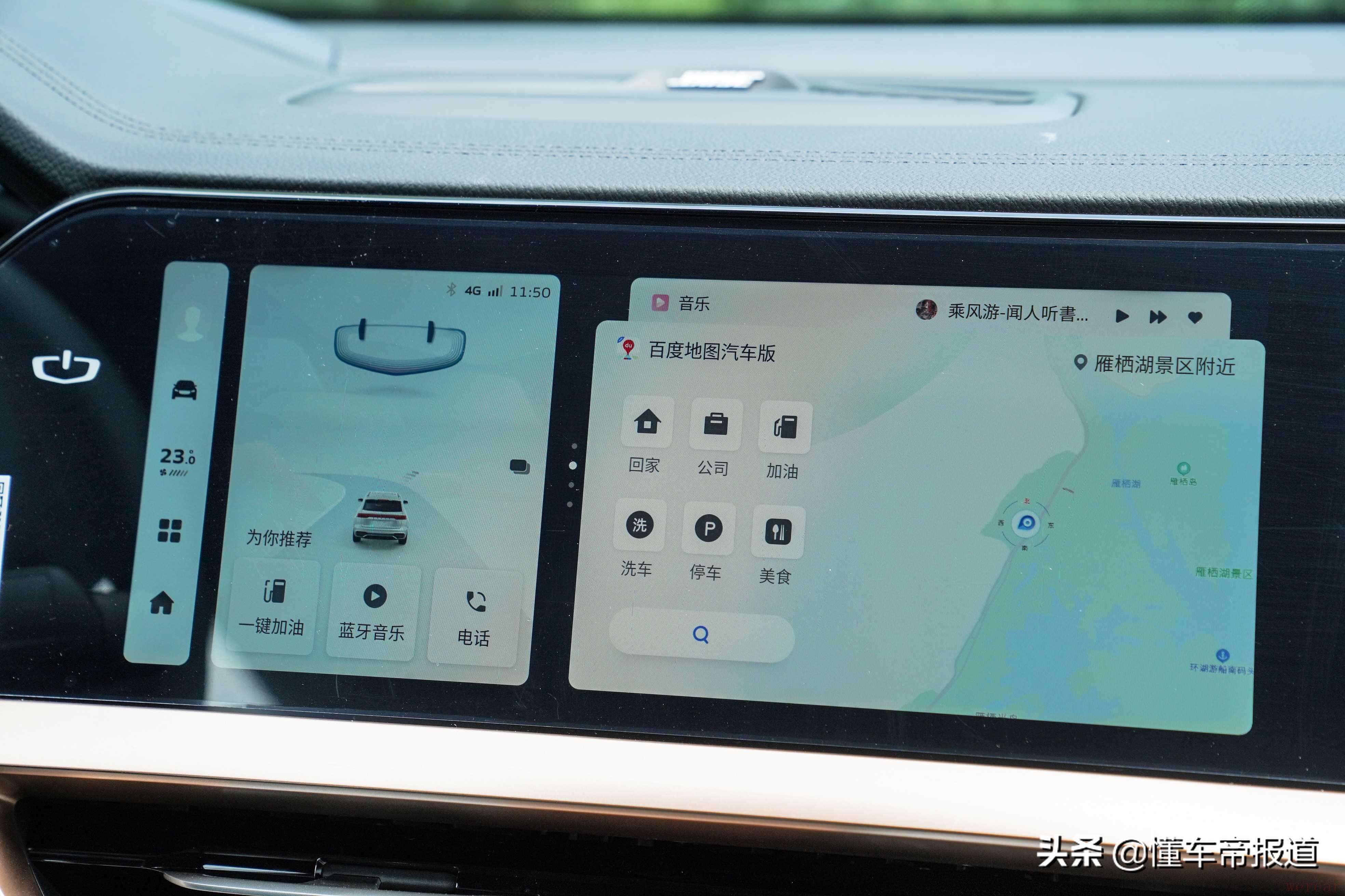 不过,或许受角度的影响,在强光状态下,驾驶者以余光查看中控显示屏的右半屏,会略受光影影响,将导航地图调整为全屏模式后,就方便很多了。副驾驶显示屏,目前提供的功能以娱乐性App的形式呈现,这毕竟是车内屏幕生态中全新的存在,其功能以及实用性还有待进一步提升以及拓展,未来或许能有更多“玩法”。
