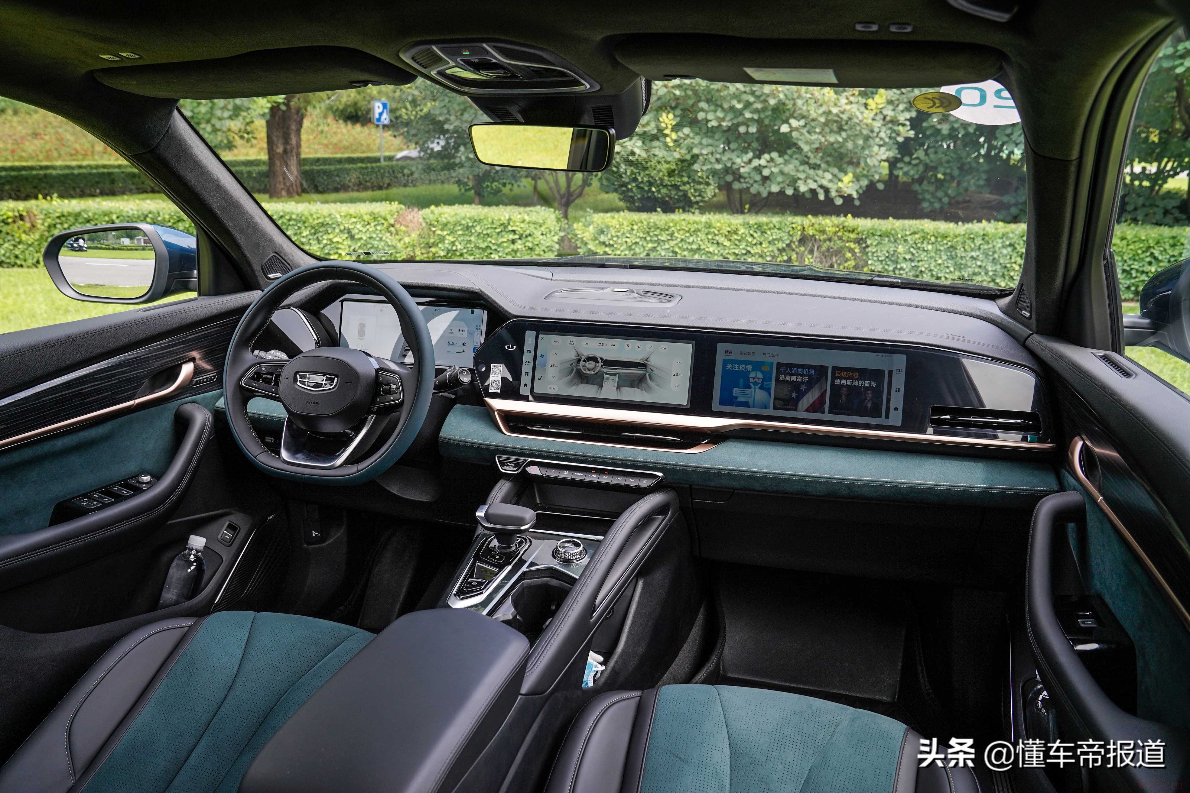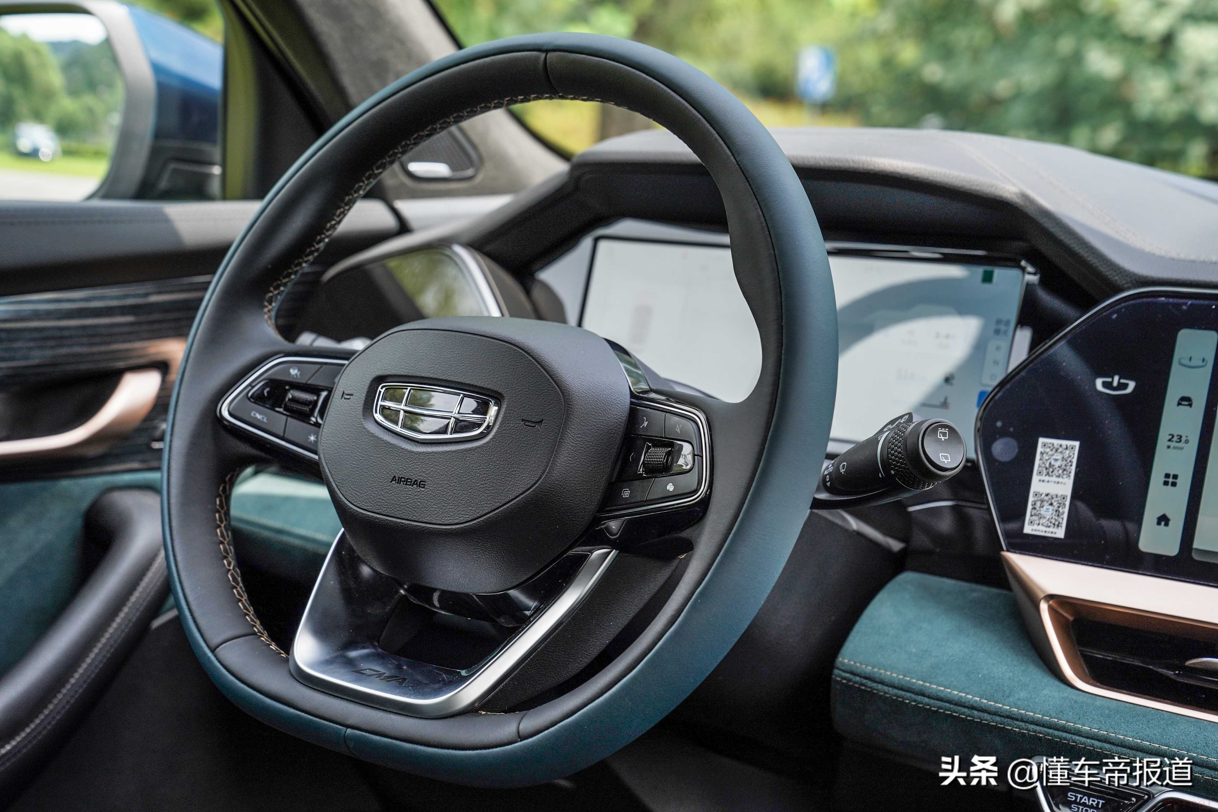 在内饰设计方面,吉利星越L科技配置、做工用料以及空间利用表现较为均衡。首先,试驾车型配备了三块显示屏幕(12.3英寸液晶仪表盘、12.3英寸中央触控屏、12.3英寸副驾娱乐信息屏),这也是星越L前期宣传的重点配置。