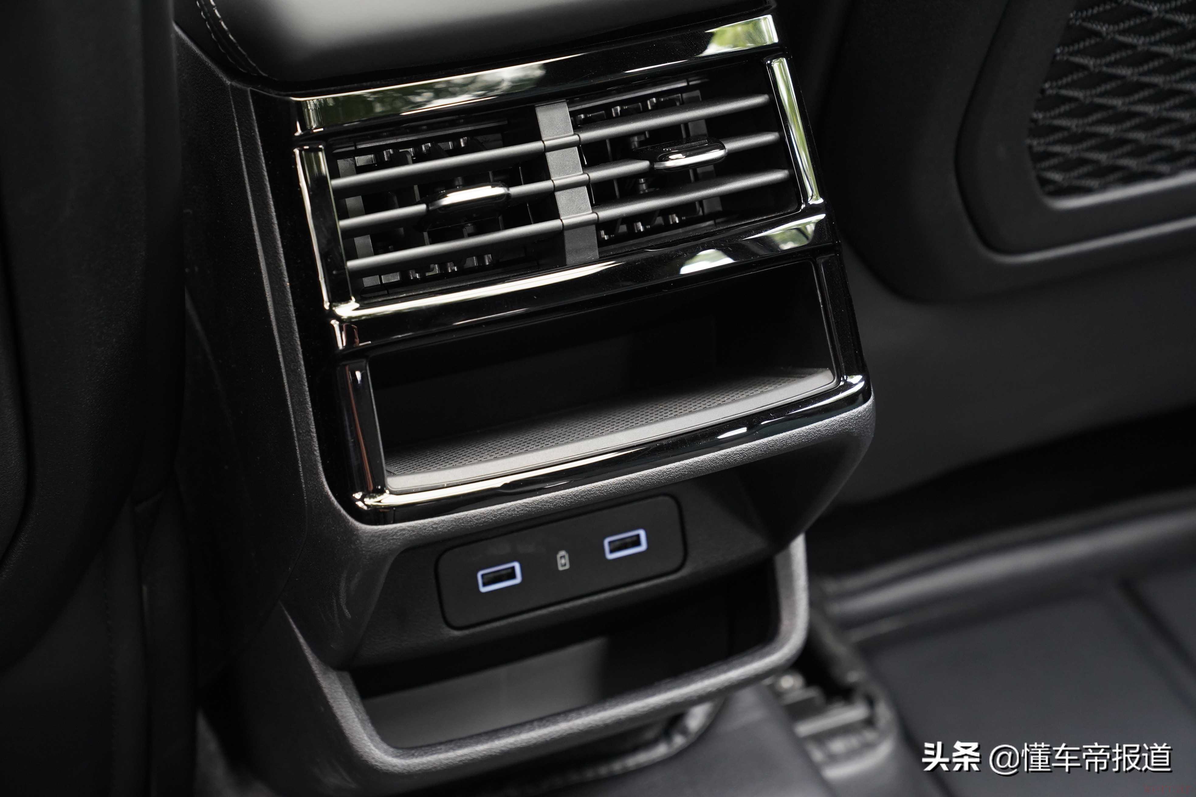 实拍车型还配置了后排空调出风口以及两个USB充电接口,由于缺少空调控制面板,该位置变为储物槽。另外,中央地台的高度为10厘米左右,不是纯平地台但高度还算可以接受。