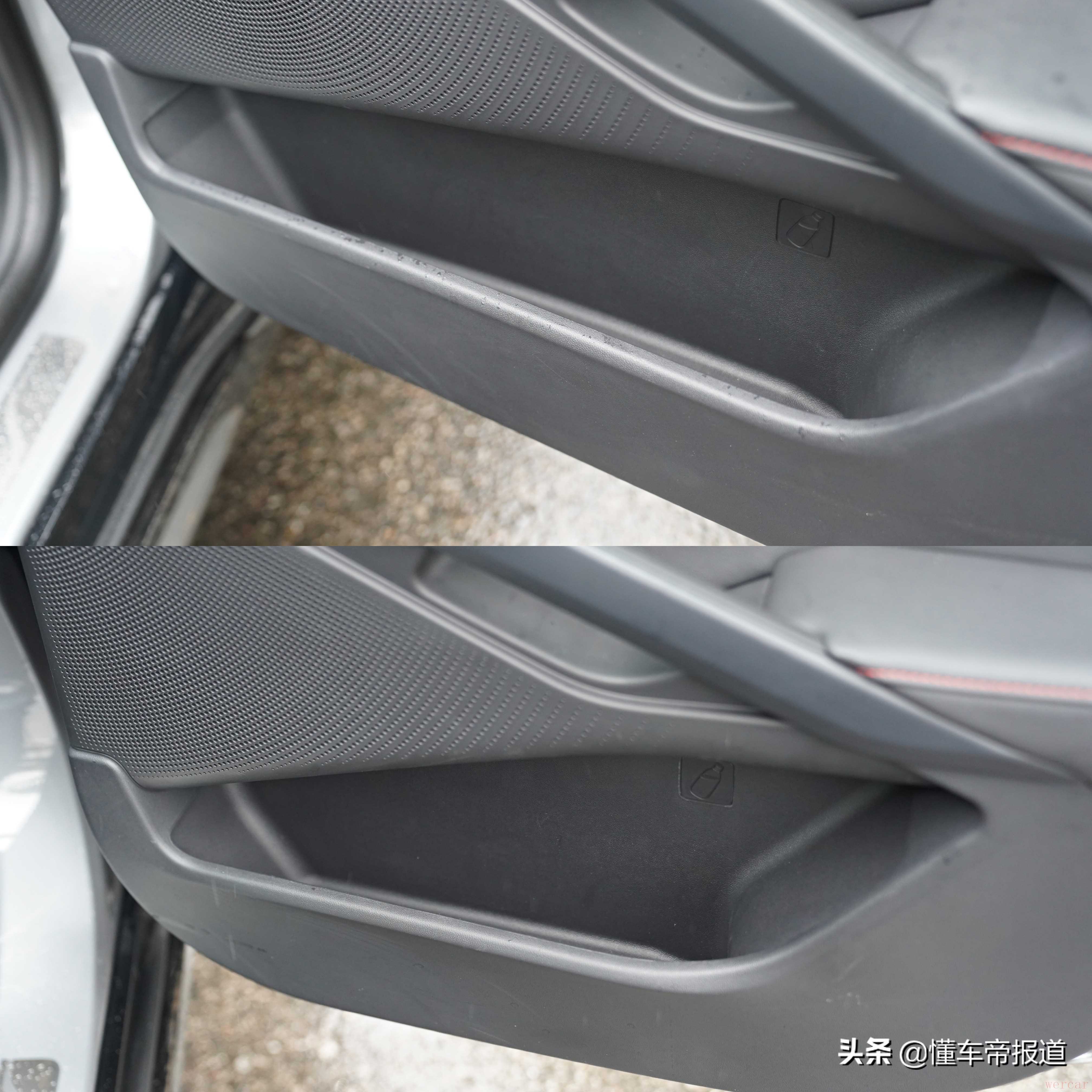前后排门板的储物格都有着不错的长度,没有加入限位器,设计师也告诉我们是有意为之,主要是增加整体的灵活度,像纸巾、伞等物品也能轻松的放入,但放较小的饮料(例如350毫升的矿泉水)在遇到车辆加速时会有明显的晃动。