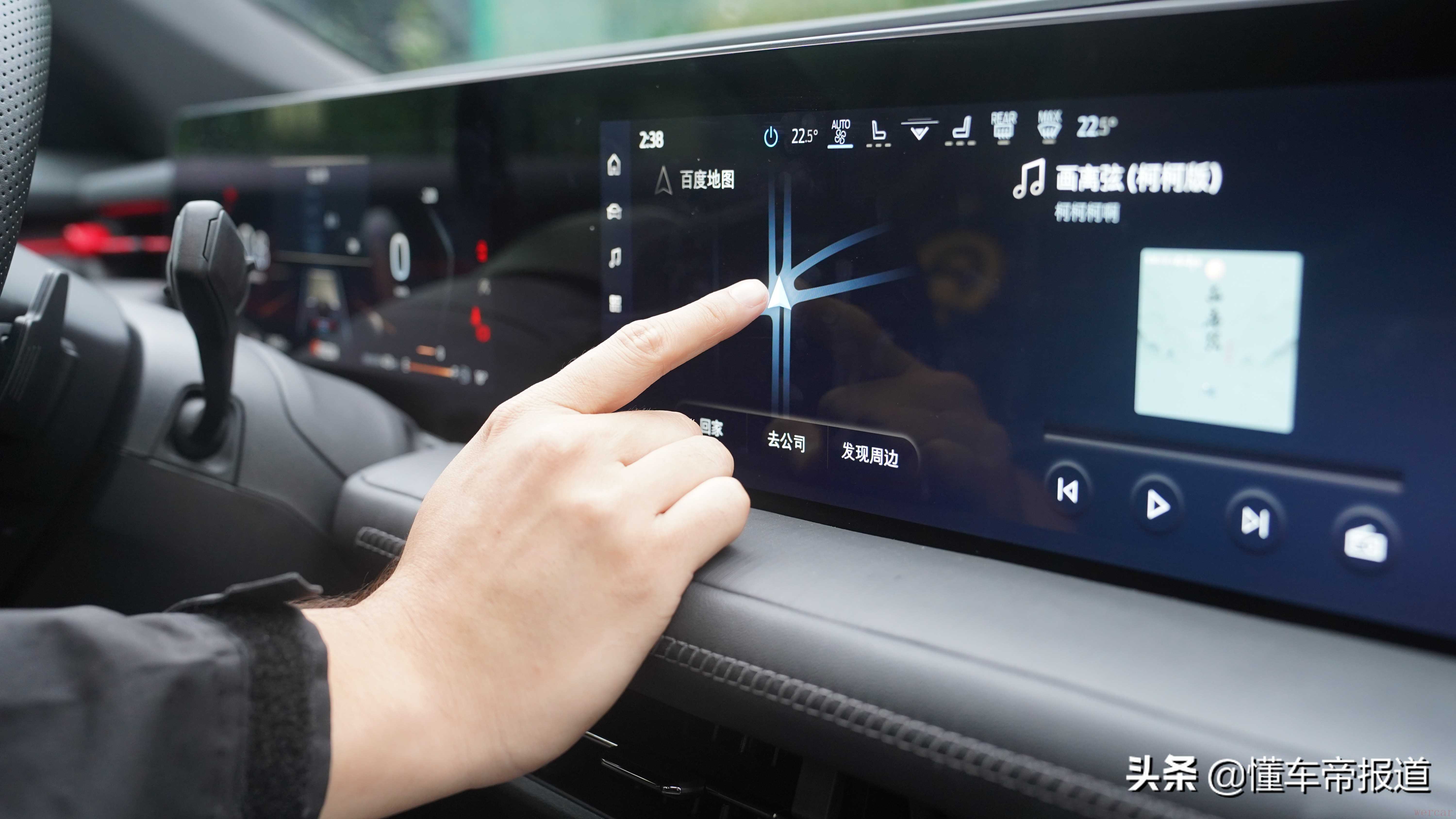 来到这辆EVOS的车厢内部,最吸引眼球的,肯定就是这块1.1米长的大屏了,这也是让很多人误以为它是一辆电动车的原因。尺寸上,左边的全液晶仪表是12.3英寸,右边的4K屏幕是27英寸。