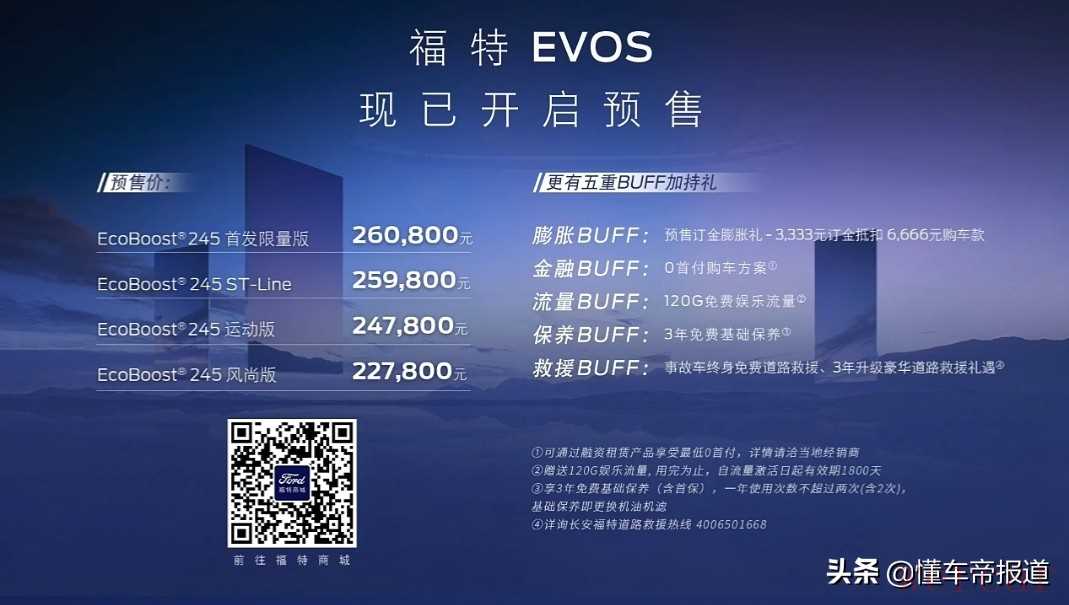 福特EVOS,定位中型轿跑SUV,不久前其四款配置的车型公布了预售价,22.78至26.08万元。