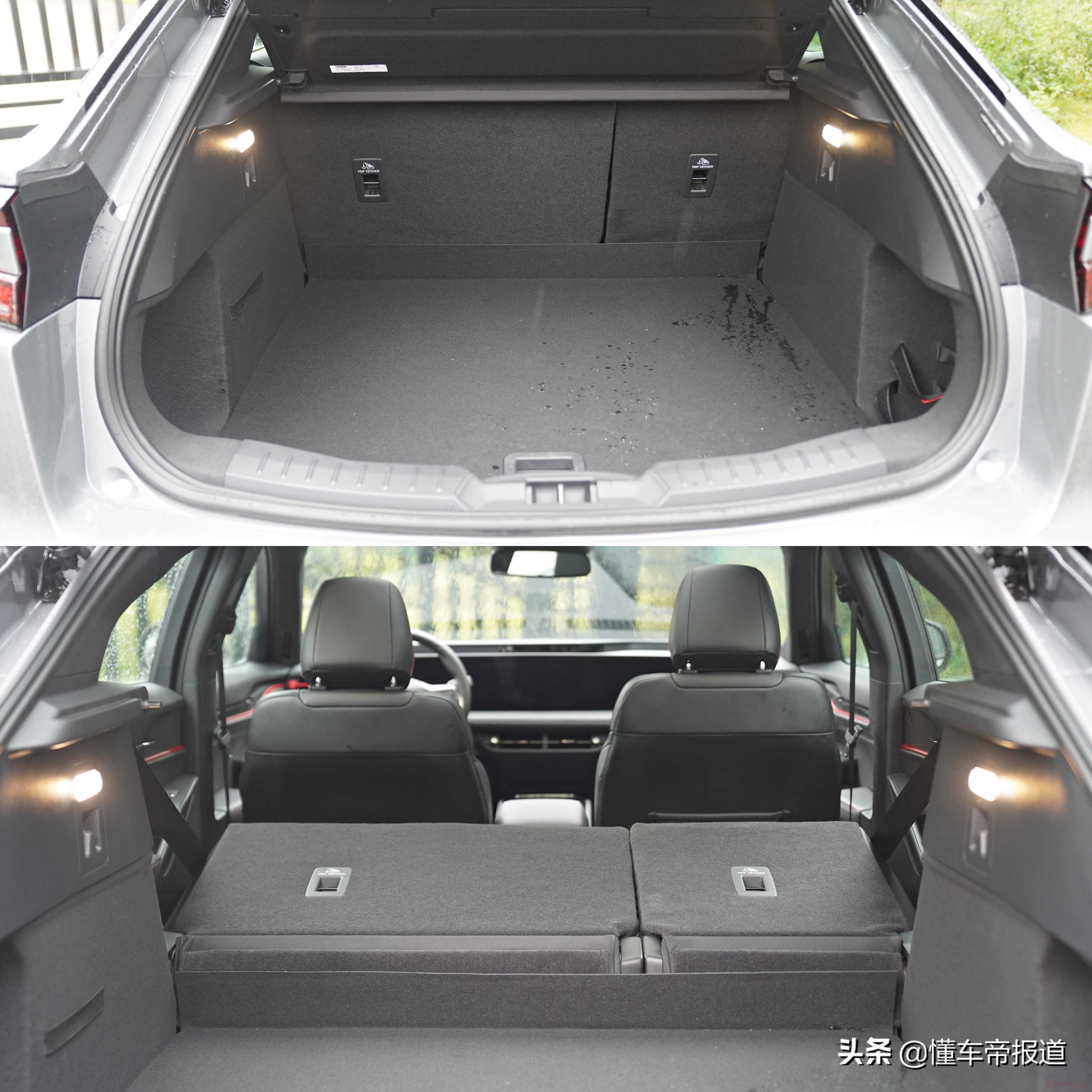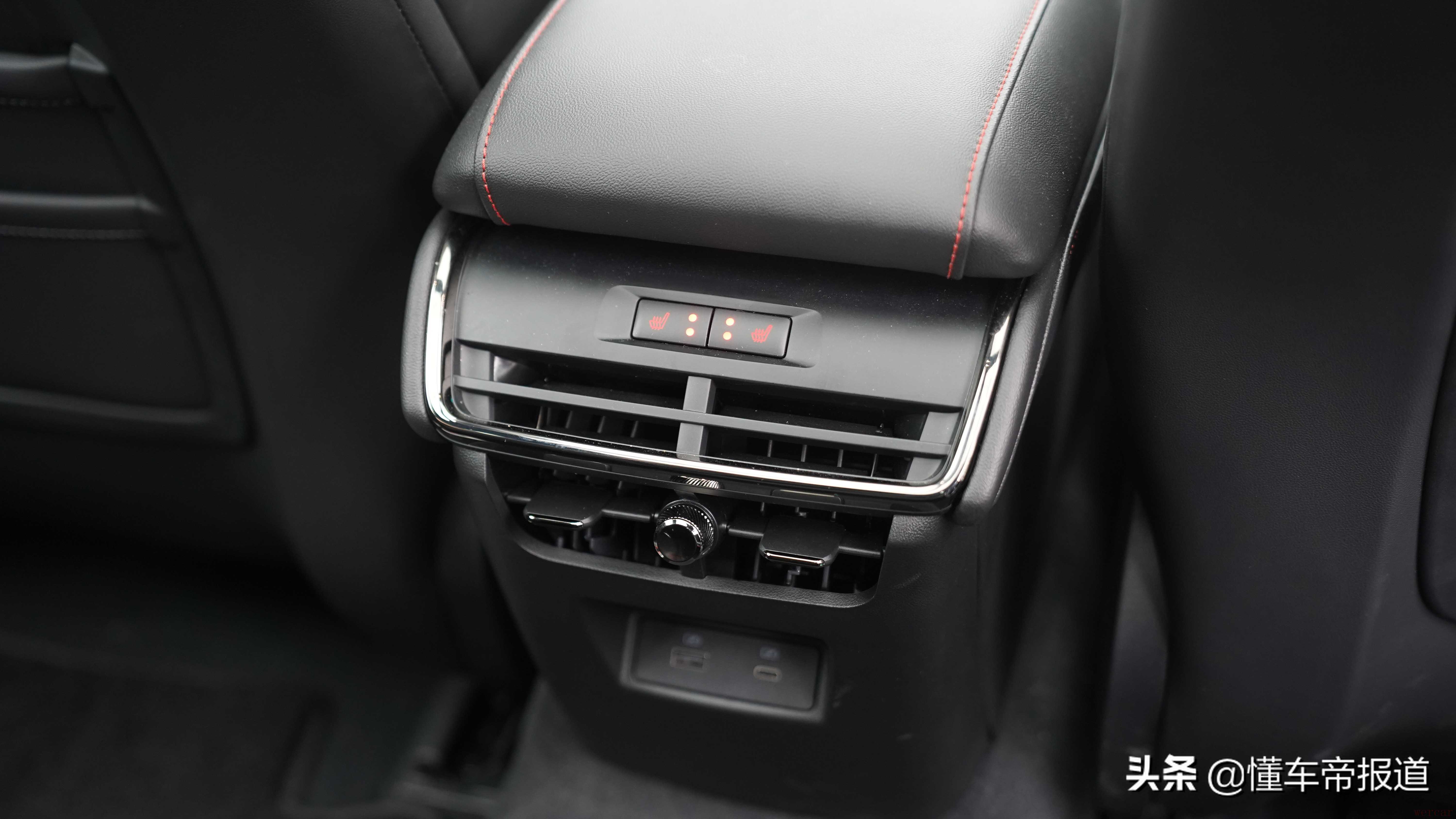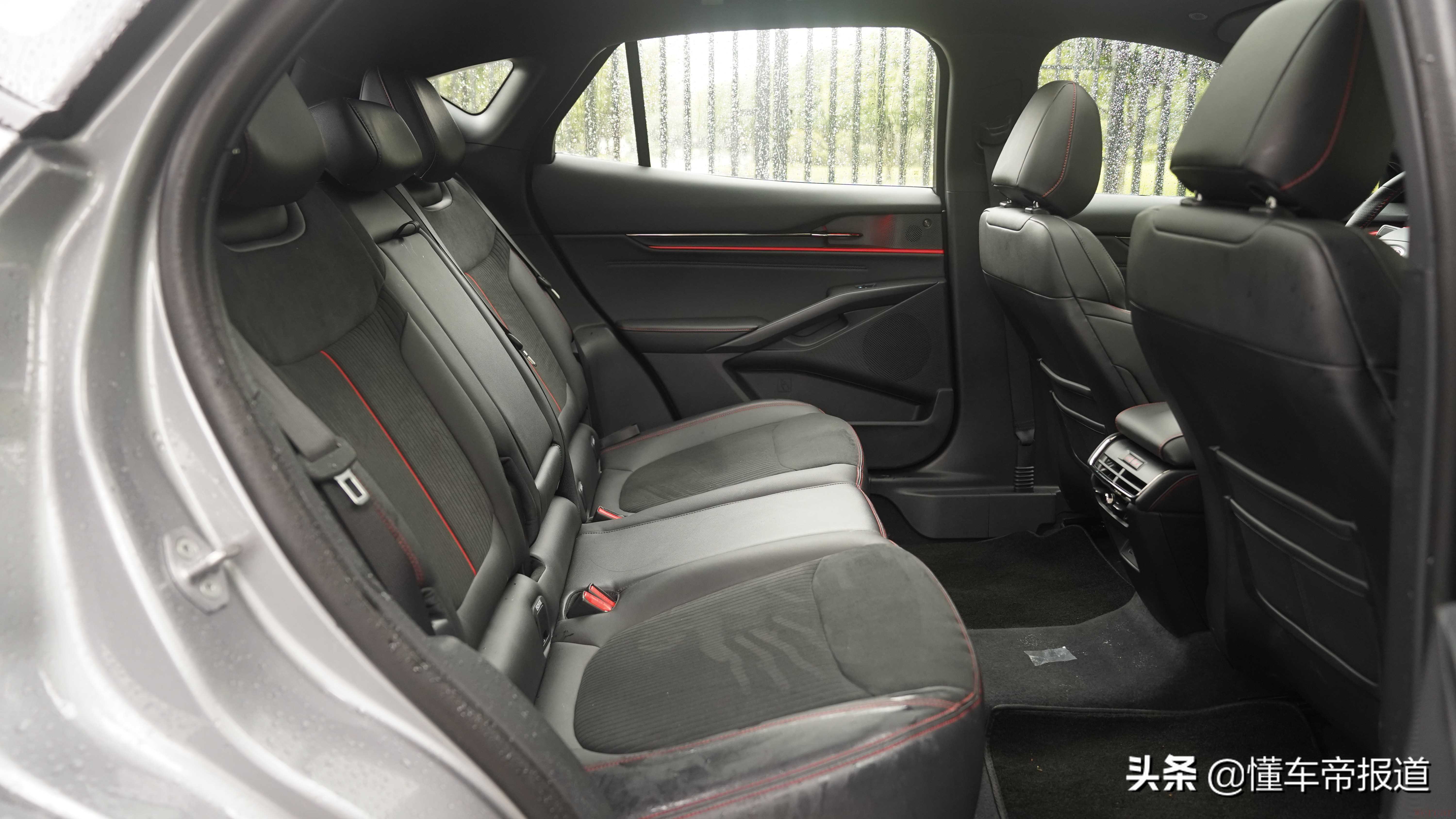 前排调整到编辑合适的坐姿后,第二排腿部还有着非常不错的余量,虽然采用了轿跑SUV的造型,但头部空间也并不觉得压抑。坐垫的长度也可以给一个不错的评价,高度要比一般的中型SUV低,更像是坐轿车的后排感觉。
