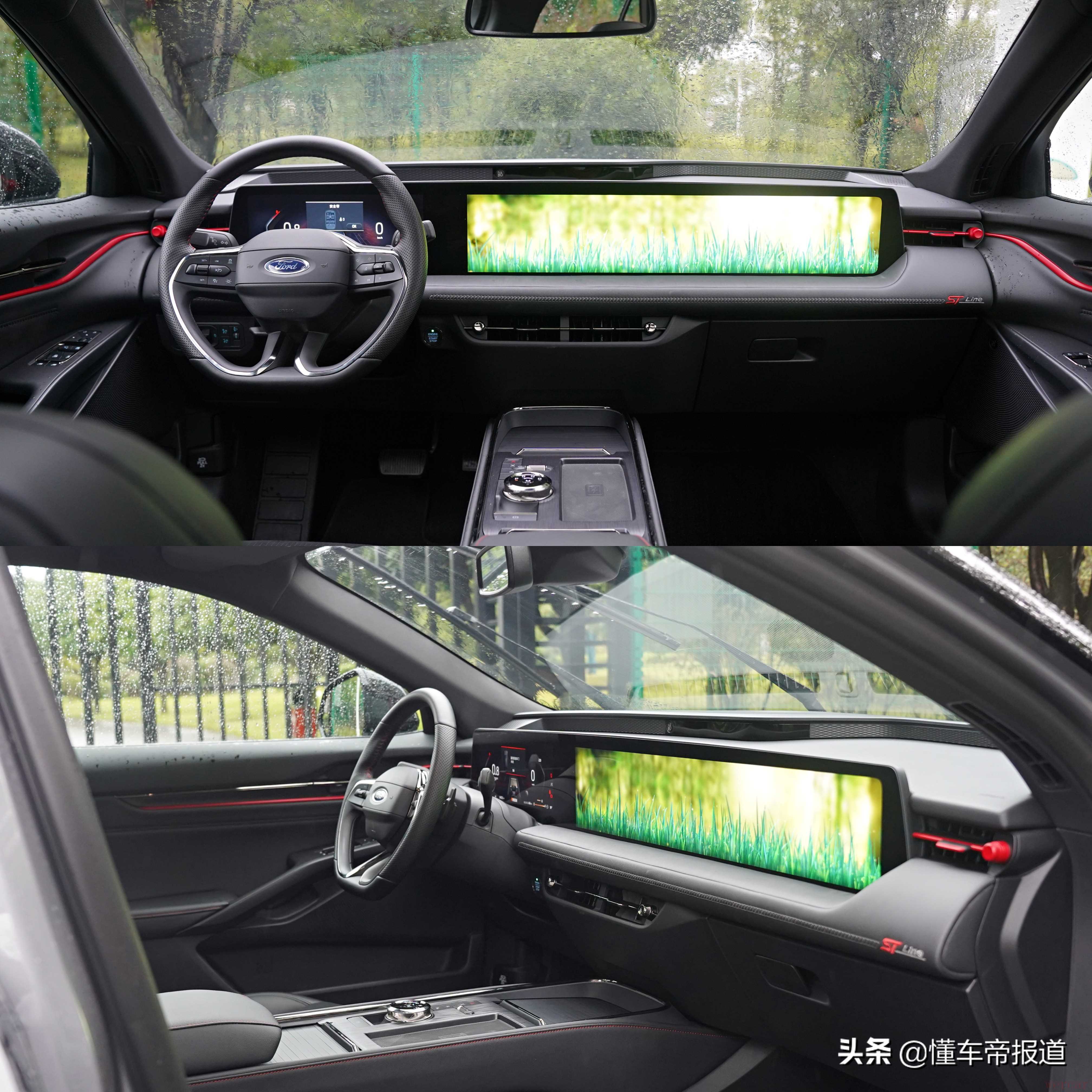 特别要提到的是它的方向盘,首先全新的四辐式设计非常动感,三九点位置的打孔皮质也有不错的握感,配合换挡拨片能给驾驶者很好的驾驶欲望;其次就是转向手感,开惯大众车型的我,在驾驶这辆车过弯的第一下,嘴角就有所上扬,没错,还是福特运动化的质感,但相对锐际、锐界等车型会更加灵敏,随角度回正力矩的增益也更加出色,韧但不沉重,车头的指向性也足够精准,整体感受要优于我不久前试驾过的领克05+,就是在不同模式下方向盘的阻尼没有明显的变化,稍显遗憾。