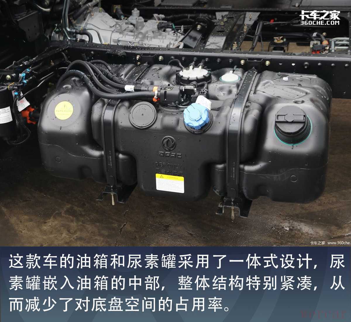 这款车的油箱和尿素罐采用了一体式设计,尿素罐嵌入油箱的中部,整体结构特别紧凑,从而减少了对底盘空间的占用率。
