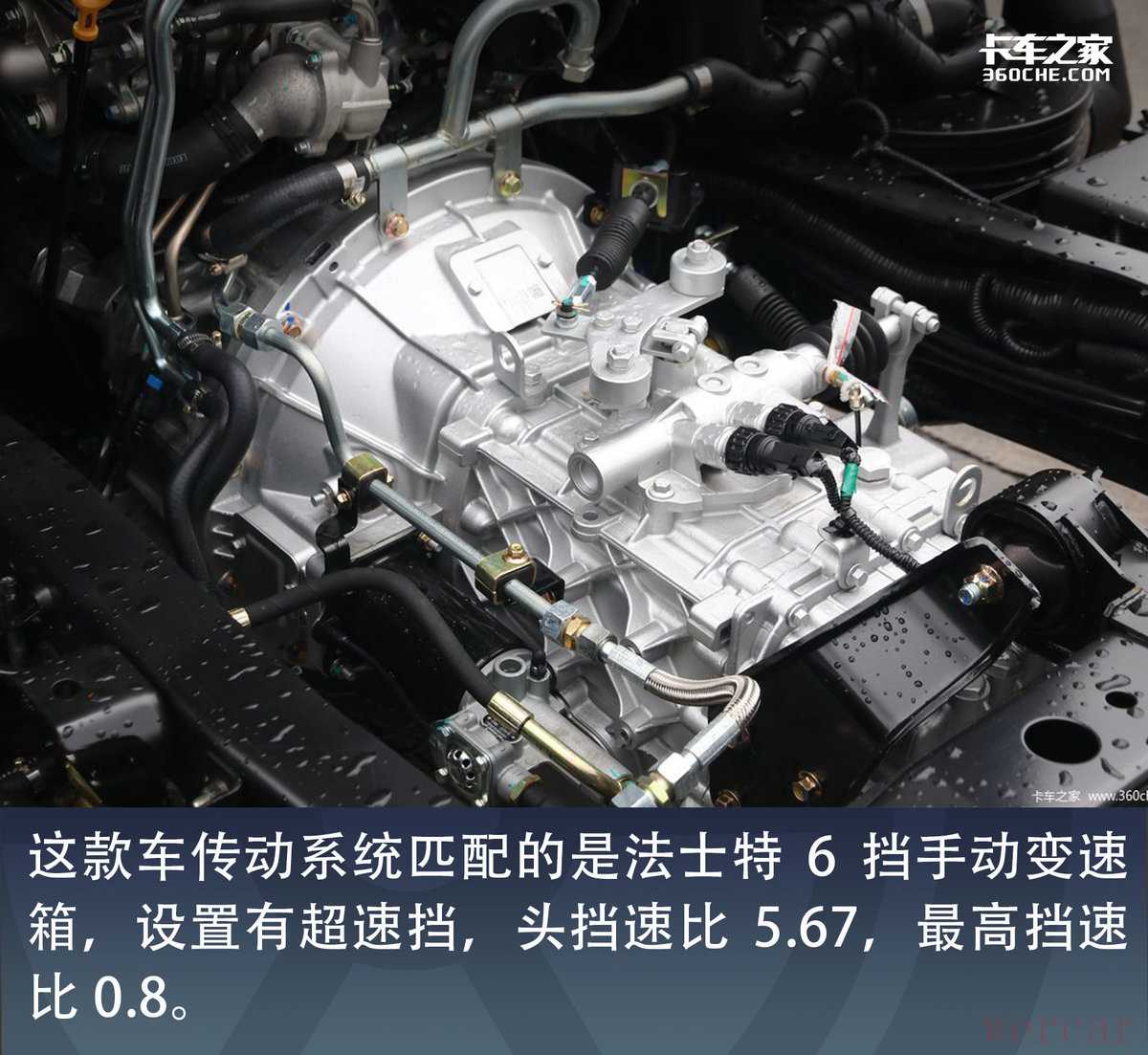 这款车传动系统匹配的是法士特6挡手动变速箱,设置有超速挡,头挡速比5.67,最高挡速比0.8。全铝合金外壳不仅可以帮助降低车辆自重,也可以加快散热。