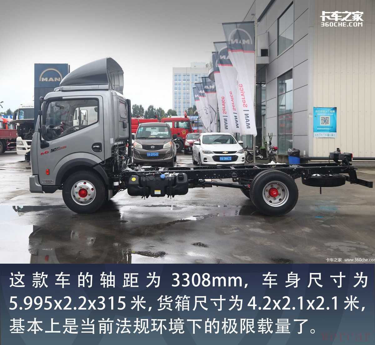 这款车的轴距为3308mm,车身尺寸为5.995x2.2x315米,货箱尺寸为4.2x2.1x2.1米,基本上是当前法规环境下的极限载量了。