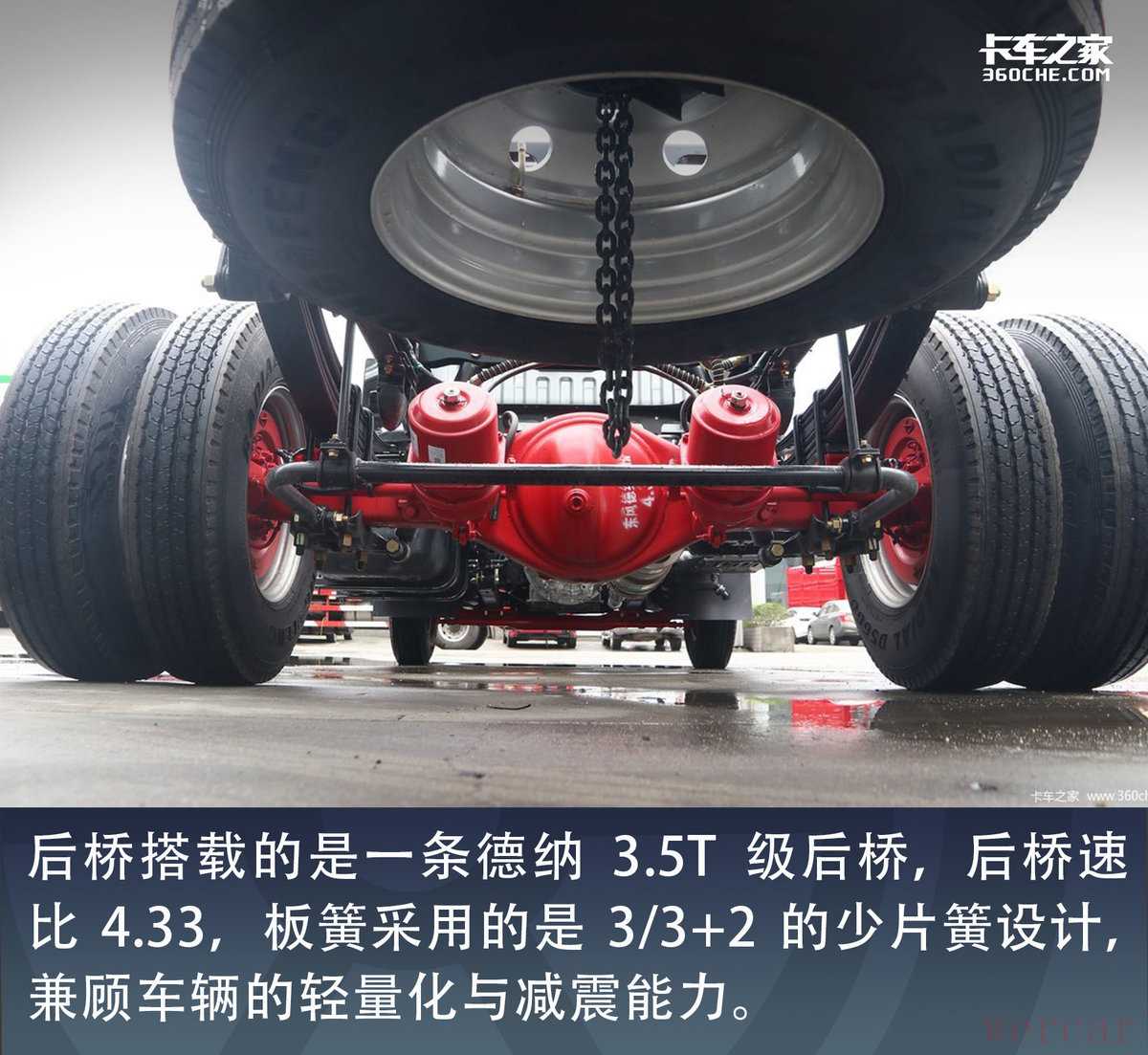 后桥搭载的是一条德纳3.5T级后桥,后桥速比4.33,板簧采用的是3/3+2的少片簧设计,兼顾车辆的轻量化与减震能力。