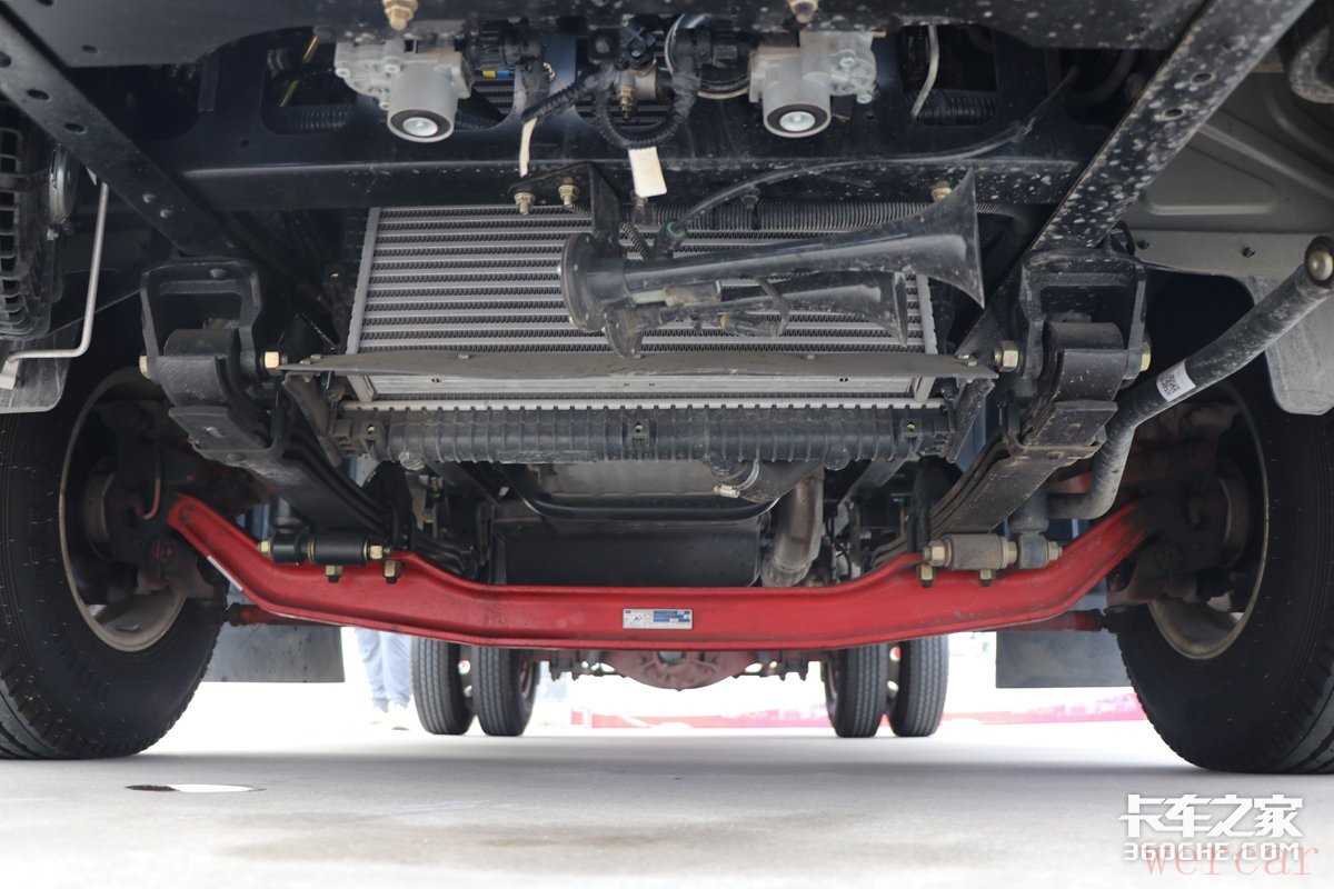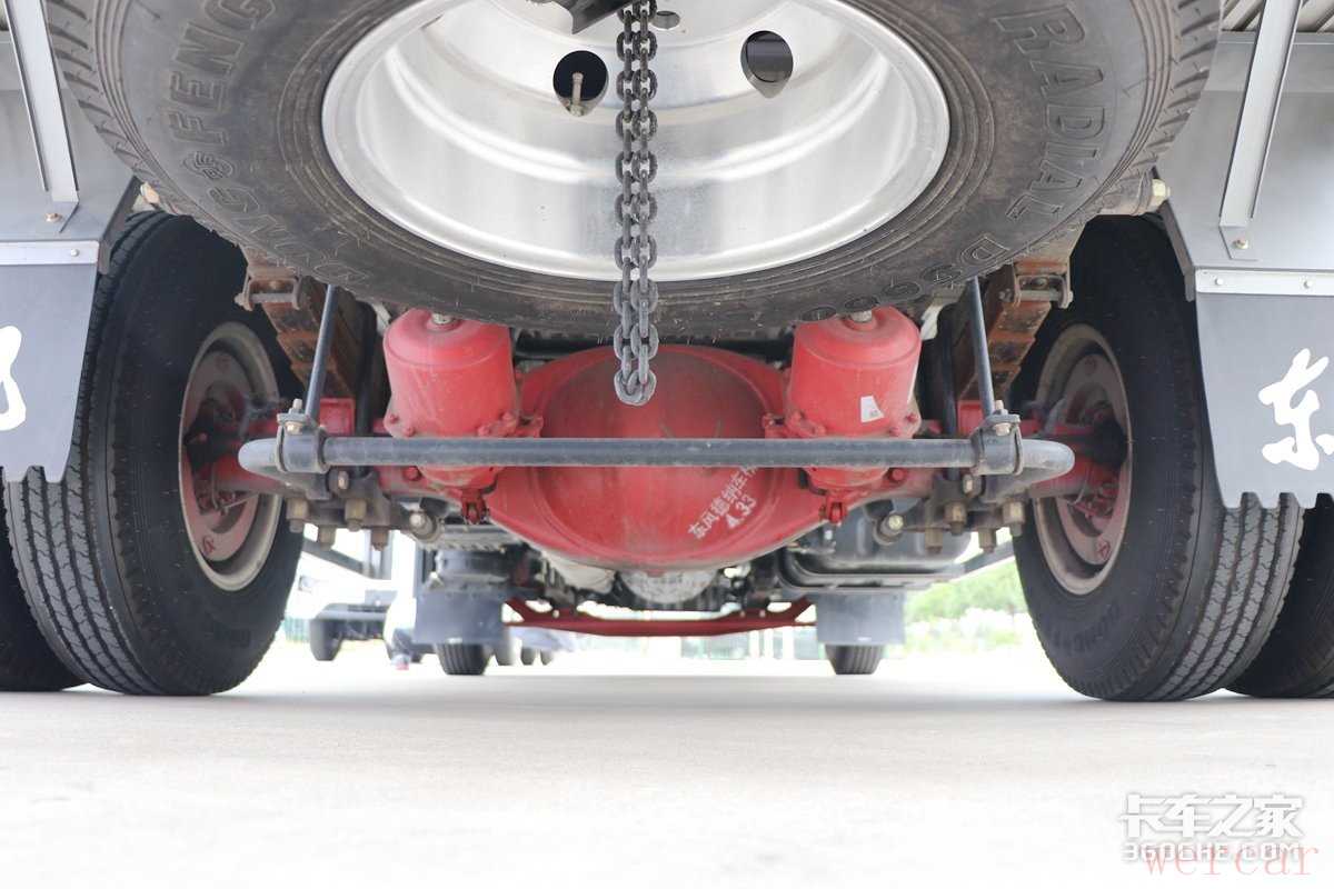 该车采用东风德纳车桥,速比为4.33,同时还配备有横向稳定杆,可以减少车辆发生侧倾的几率,增加操控稳定性。在悬架形式上,该车前桥采用3片少片簧设计,后桥为3+2主副板簧结构。