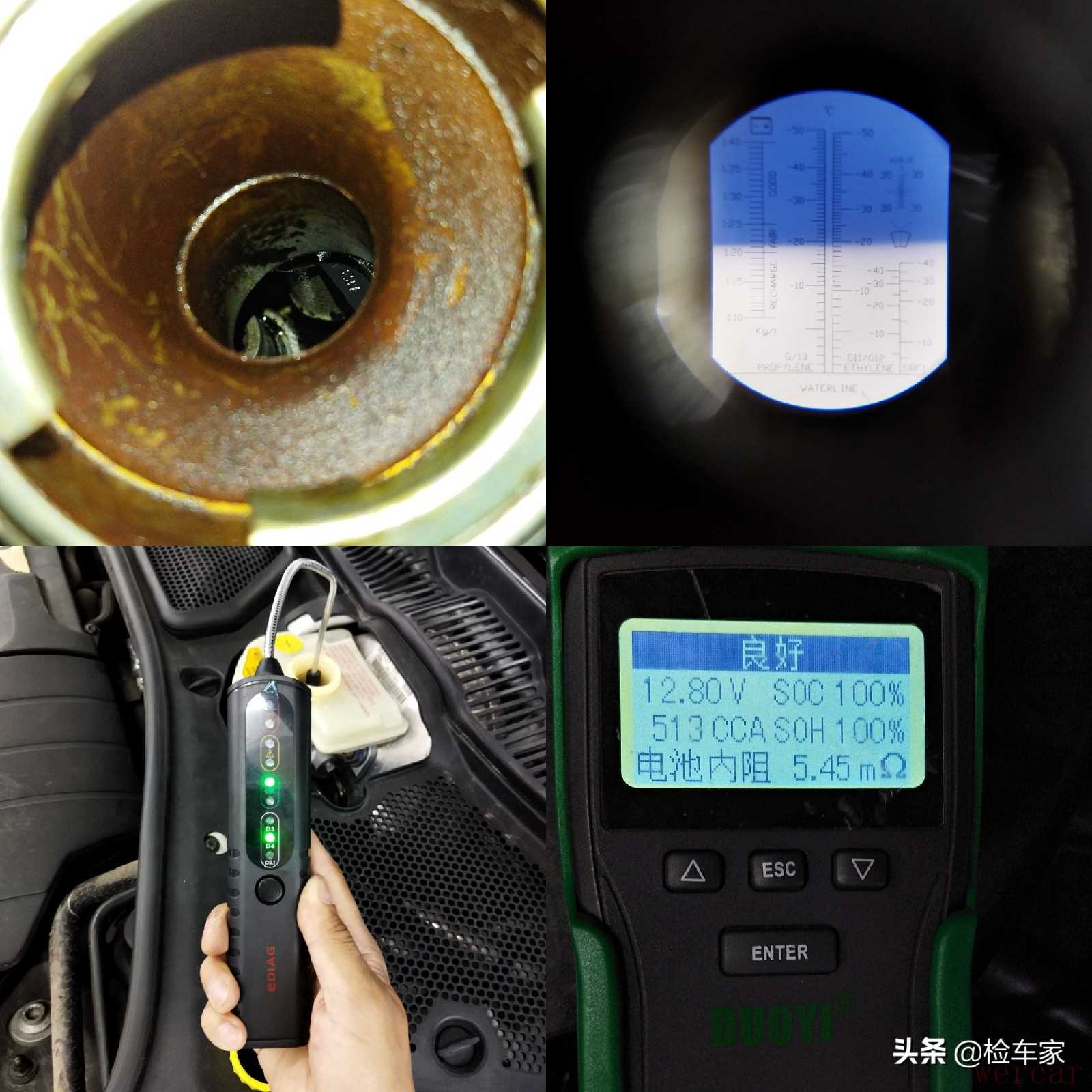 然后是全车油水,发现状态不是很好,发动机机油需要更换,油泥积碳太多,看来之前保养得不算好,防冻液冰点不足,也需要更换,就只有刹车油暂时不需要处理,电瓶因为是才换的也没有问题。后期入手需要做一次大的保养,因为是W12,所以开销也不小啊。下面来看看内饰。