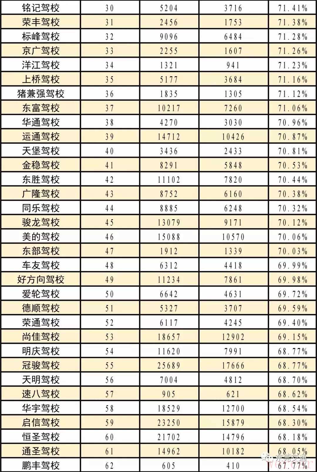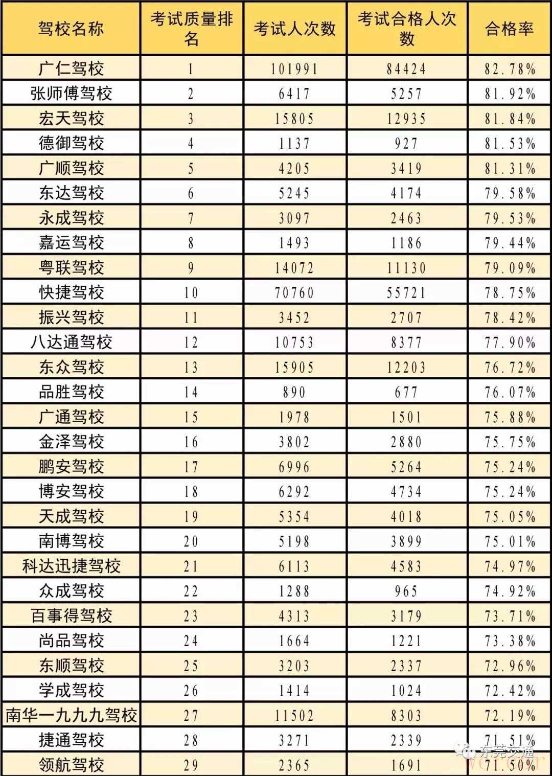 1 广仁驾校 2张师傅驾校 3 宏天驾校 4 德御驾校 5 广顺驾校 6 东达驾校 7 永成驾校 8 嘉运驾校 9 粤联驾校 10 快捷驾校 在68家驾驶员培训机构里