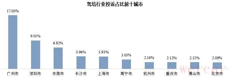 根据地域数据显示,驾培行业相关投诉中,广州市的用户以17.00%的投诉占比位列第一;深圳市、东莞市占比分别为9.01%和6.82%,排名第二、第三。由此可见,广东省的驾校应该注重提高服务质量、加强沟通、完善管理制度和强化宣传,以减少投诉的发生,提高学员的满意度和社会认可度。