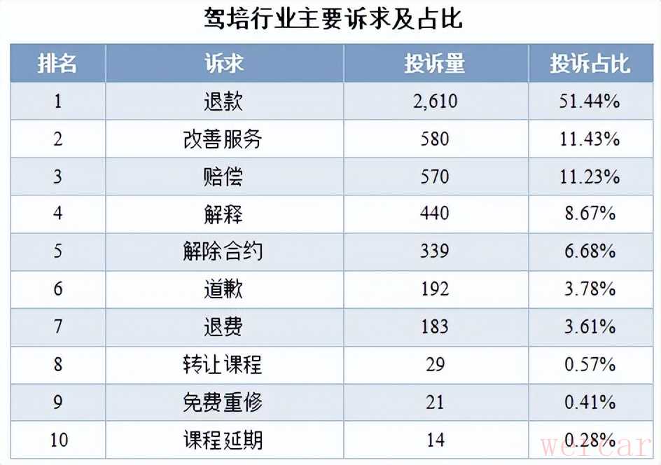 驾培行业投诉要求主要包含退款、改善服务以及赔偿等几个方面。其中,要求退款的投诉高达2,610件,位列首位;要求改善服务排名第二,有580件;由于学车服务过程驾校驾驶员对学员态度恶劣,而要求赔偿的诉求570件,排名第三。
