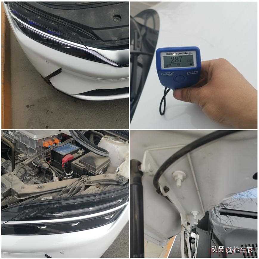 取完值后就可以正式开始外观的检测了。第一先是前脸部分,因为前保险杠贴了膜,可以用光洁如新来形容也不为过,没有划痕、破损,更没有更换;机舱盖也是,从图中数值就可以看到并没有进行过任何修复;取下机舱里的饰板后发现不管是大灯、轮旋还是减震器座都完好无损一切正常,只是稍微有点脏。不出意外发动机舱盖铰链也是没有拆卸痕迹的。这让我不得不怀疑3万公里是怎么开出来的了。