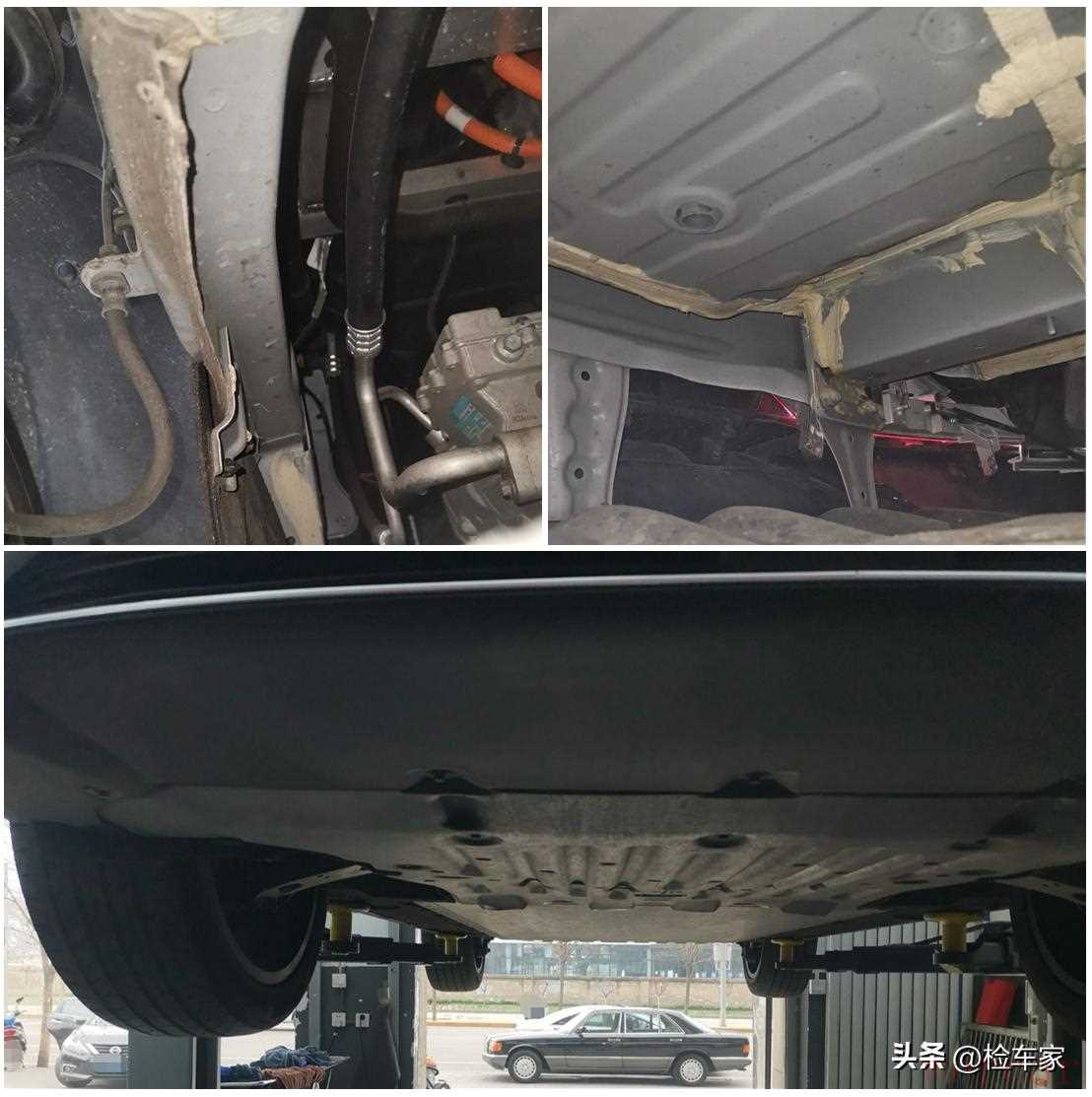 随后我们在附近找了一家汽修店接了举升机一用,在途中我也感受到了这辆比亚迪的加速度,甩了燃油车几条街。我重点看了一下各个关键结构,车身纵梁、横梁都没有焊接、变形的地方,只有车身底板的护板有些损坏,不过这也是正常现象,谁也无法避免在行车途中底部发生擦挂。