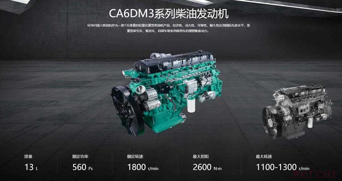在发动机方面,实拍车型搭载了一台型号为解放动力锡柴CA6DM3-56E6的直列六缸柴油发动机,排量为12.52升,满足国六排放标准。最大输出功率415kw(560马力),最大输出扭矩为2600牛米,在1100-1300rpm区间内可以输出峰值扭矩。