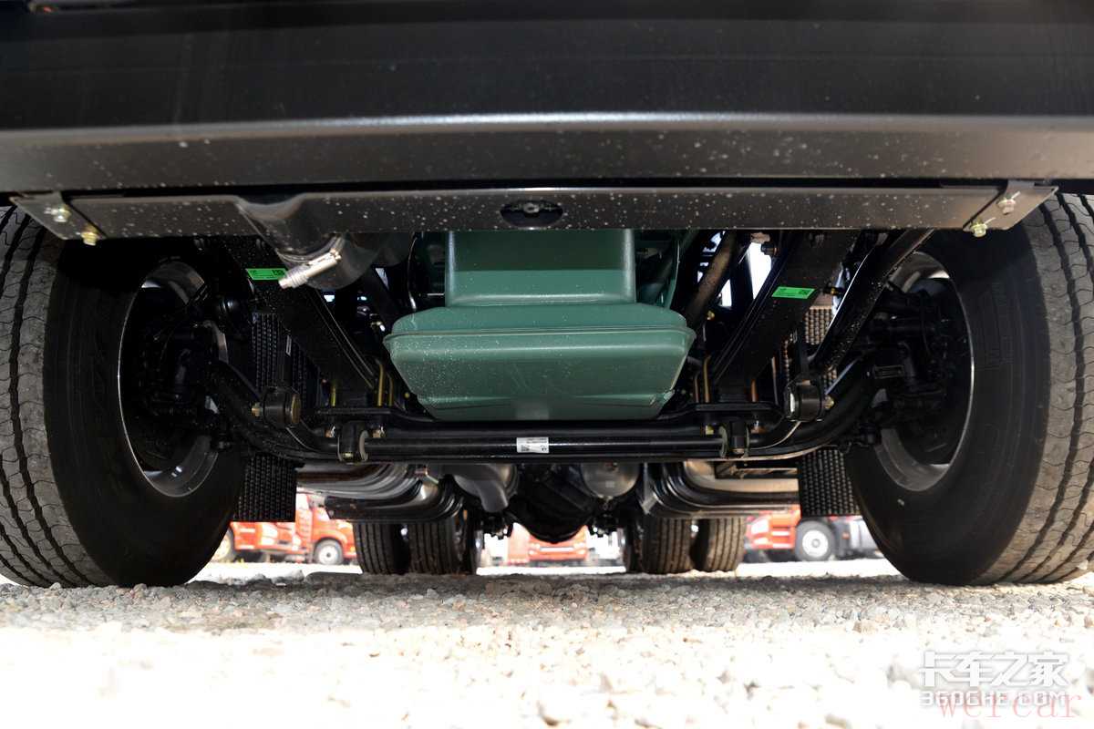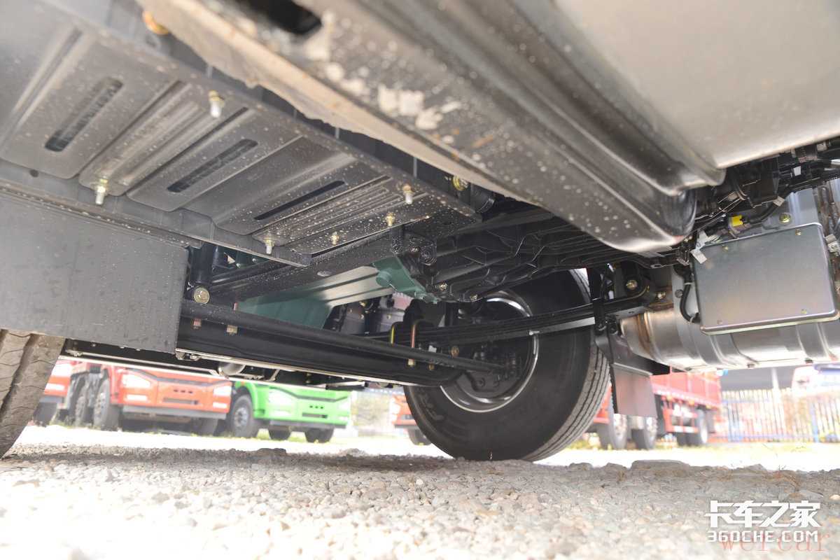 最后来到底盘区域,实拍车型采用了前2后3的钢板弹簧悬架,如果有运输高附加值货物或者甩挂运输需求也可以选择气囊桥。这台车型的后桥速比为3.727,通过卡车之家车速计算器计算,这台解放J7在1100-1300rpm的经济转速区间内,最高平均时速可达74km/h—88km/H,非常高效。