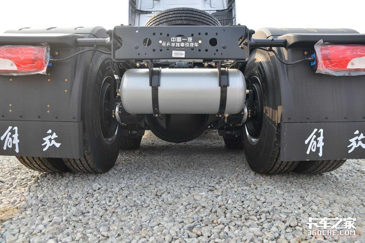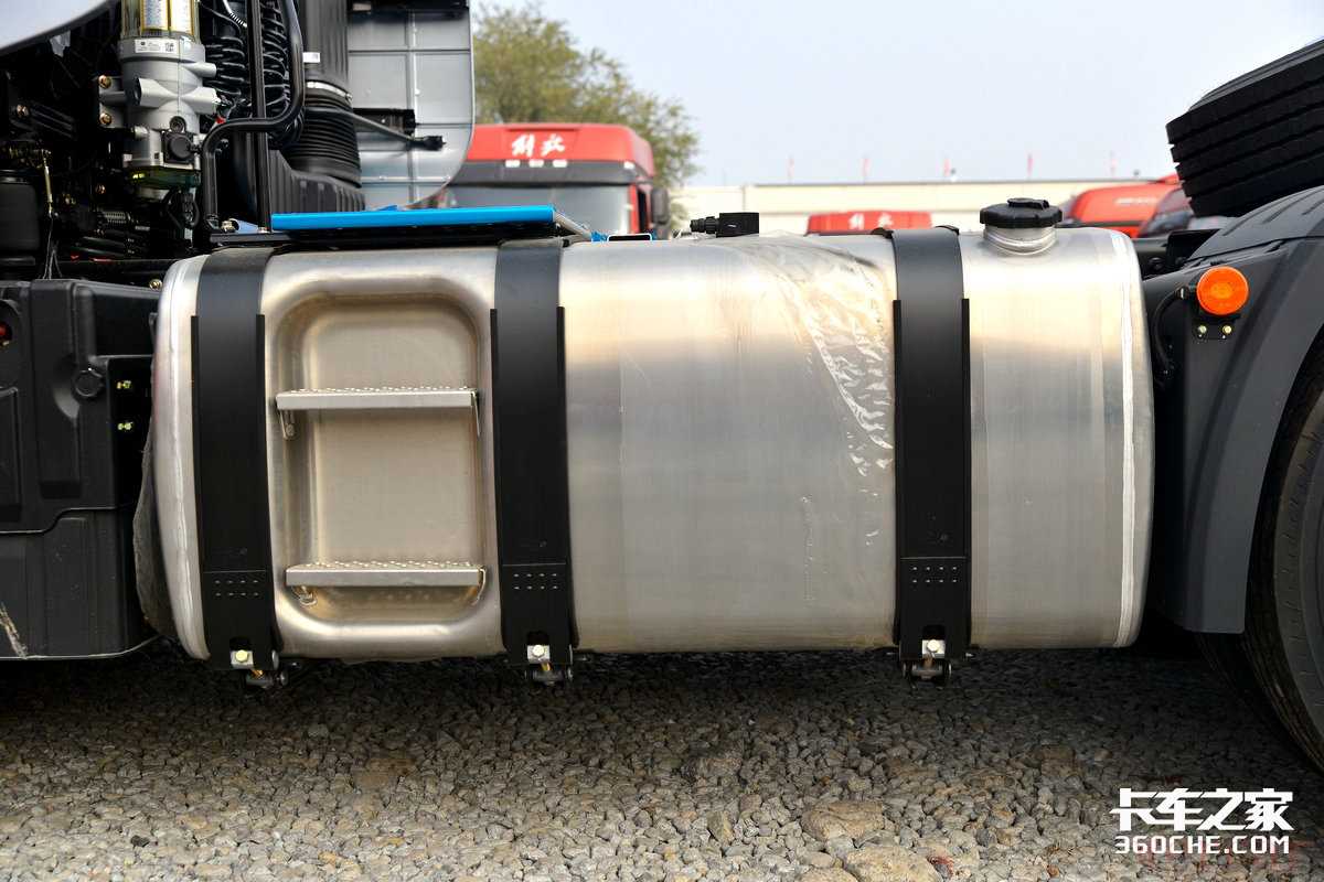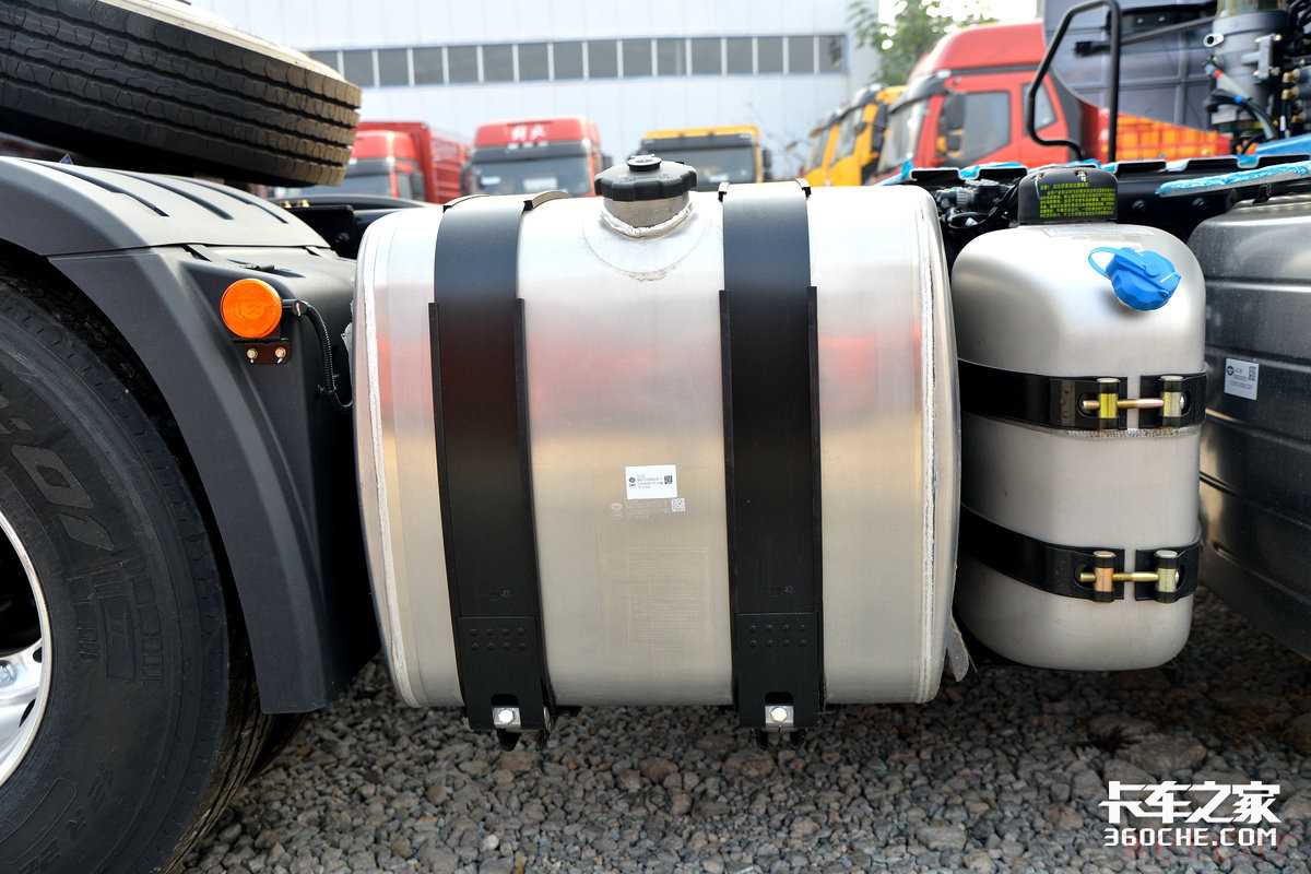 在油箱区域,实拍车型配备了铝合金制式油箱,整体重量更轻盈,并且左右油箱相加共计1100升,可以为J7至少提供3000km左右的续航里程,单次加满即便是跨越多省的干线运输,也不在话下。此外J7同样配备了解放独家研发的气驱尿素装置,除了能够更加均匀的喷洒在后处理之中,卡友再也不用担心尿素喷嘴被烧坏。