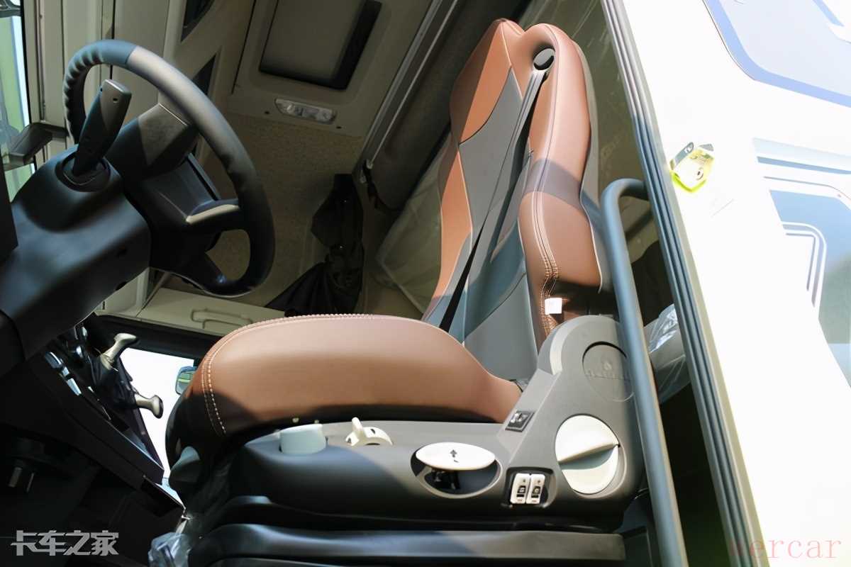 打开车门,可以看到主驾驶座配备有格拉默气囊减震座椅,除了支持基本的前后、高低、仰角调节外,它还带有一键充放气和两段气囊腰托,配合上四点气囊悬浮驾驶室,长途驾驶的舒适性得到保证。座椅支持通风加热功能,让卡友不论在冬天还是夏天都能拥有不错的驾乘体验。