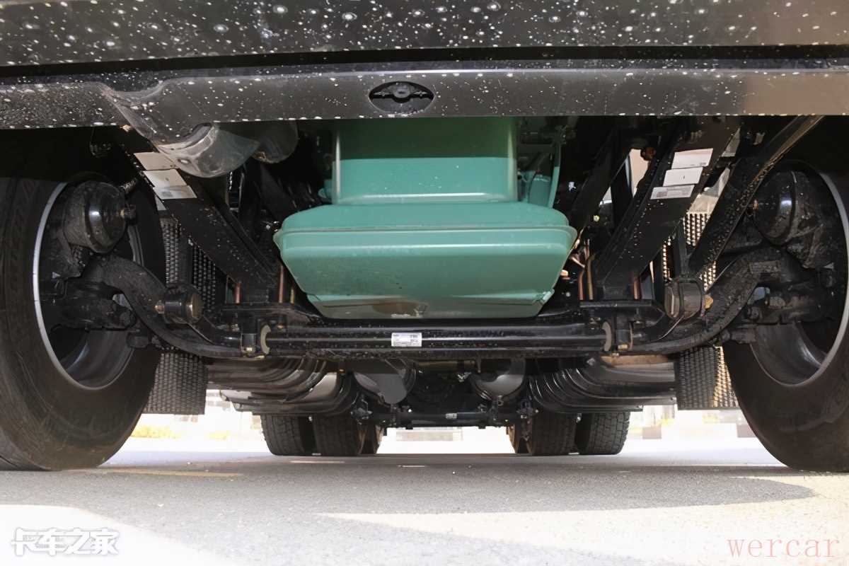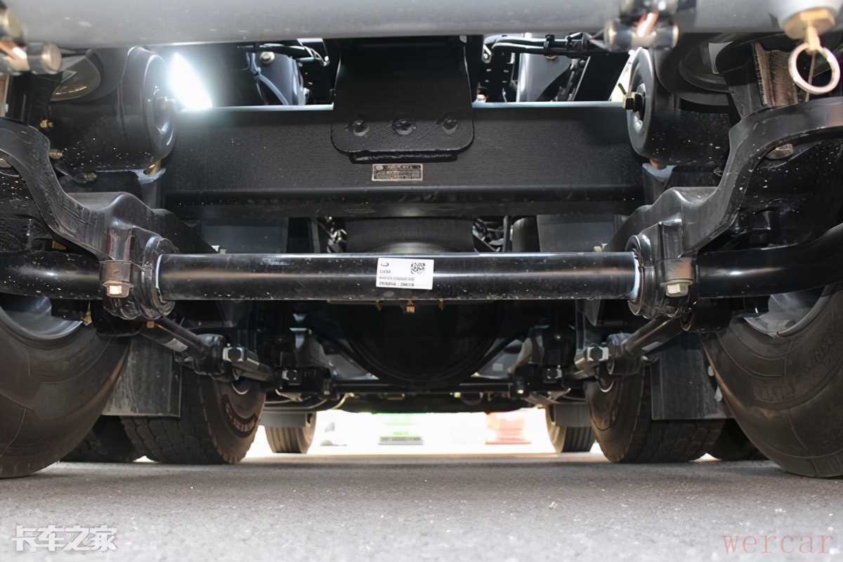 车桥方面,整车采用新F7N前轴和498冲焊后桥,后桥速比为2.688。大马力+直接挡+小速比的搭配,使得这款车更加适用于高速物流工况。为了使行车时安全性更高,整车前后均采用盘式制动,盘式制动相比鼓式制动的优势在于制动效果和散热效果更好,对各种路面都有良好的适应能力。