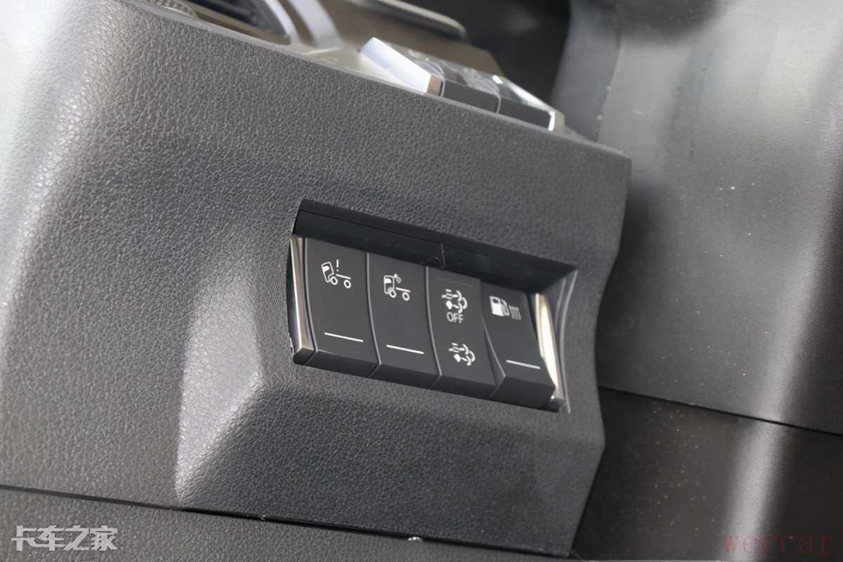 中控台区域主要布置有中控大屏、自动空调、旋钮式换挡开关和轮间差速锁、主副油箱切换开关、低速模式和坡道辅助按键、提升桥升降开关等按键。