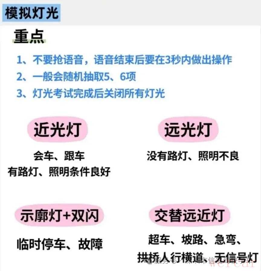 3⃣ 抢指令操作:耐心等待语音指令结束再操作,抢指令只会让你提前告别考试。特别是模拟灯光的,等原因播报完了之后再操作。 4⃣ 转向灯使用:转向灯不仅是信号,更是安全的保障。记得提前打灯,并保持3秒以上。这个细节大家的教练应该都会讲。但是在实际操作中还是不要忽略的。